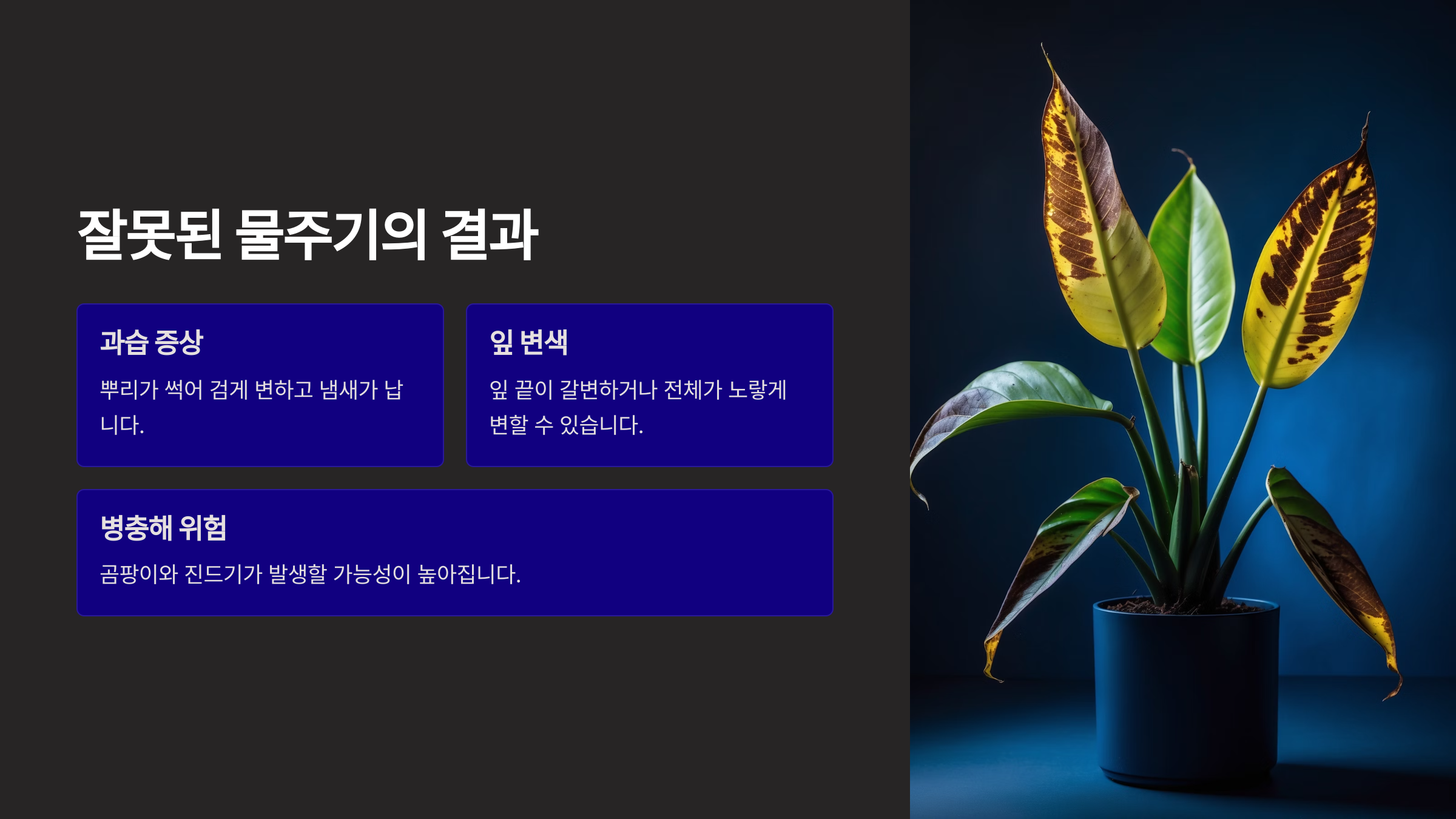 | 잎 끝 갈변 | 과습 | 물주기 간격 늘리기 |