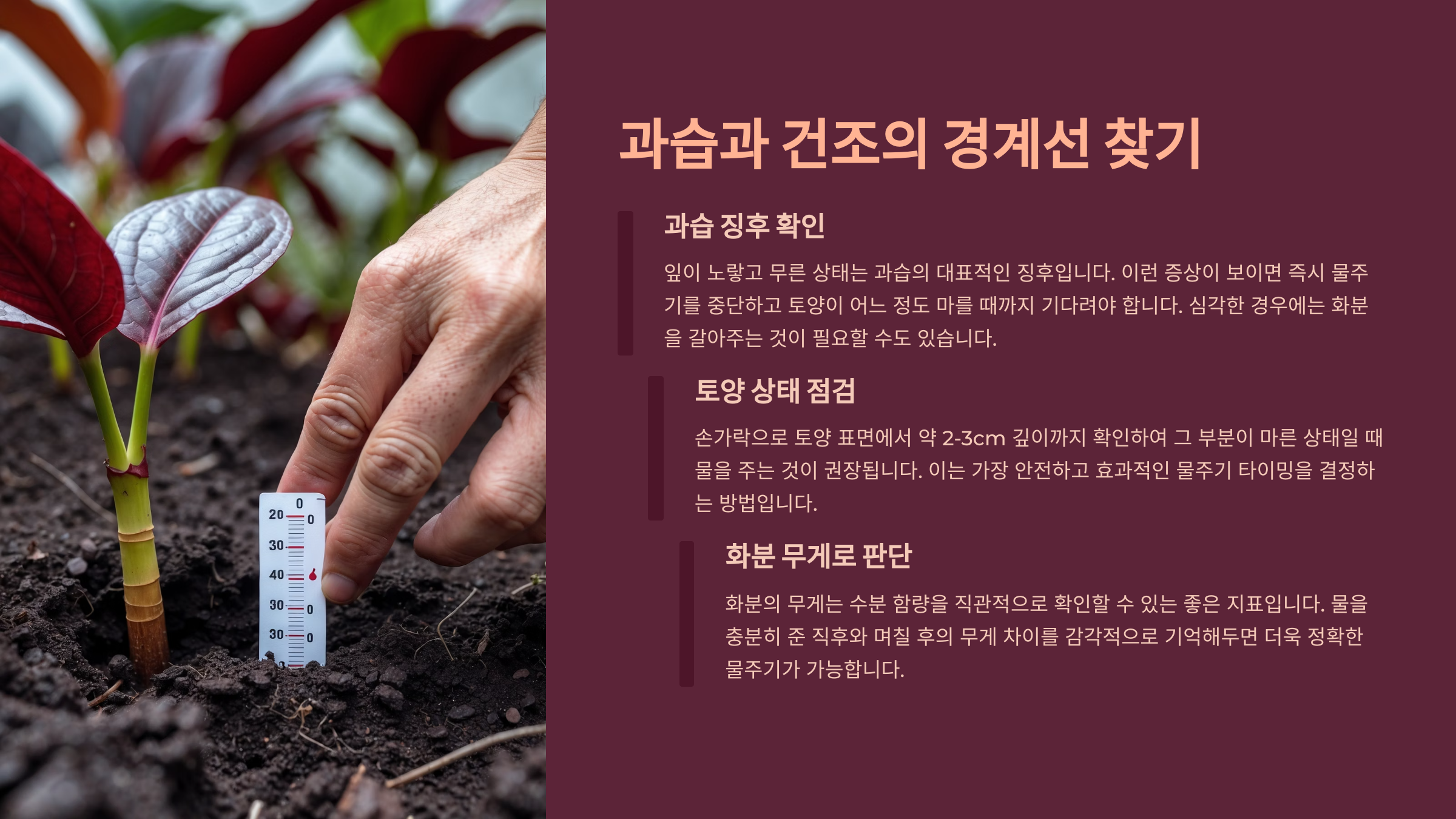 | 흙 건조 체크 | 2~3cm 깊이 확인 후 물 주기 |