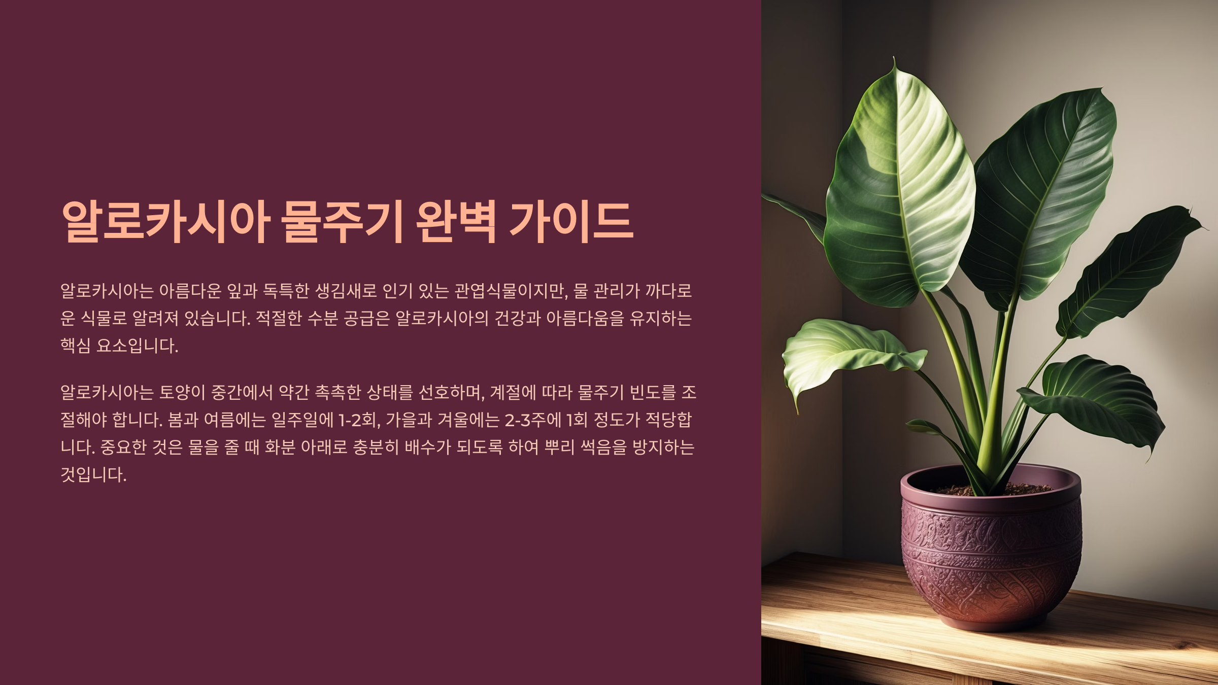 알로카시아는 매력적인 외형 덕분에 많은 사람들의 사랑을 받는 식물이죠. 하지만 건강하게 키우기 위해서는 무엇보다 '물관리'가 가장 중요해요! 특히 알로카시아는 습도와 수분에 민감하기 때문에, 올바른 물주기 방법을 아는 것이 필수랍니다. 😊