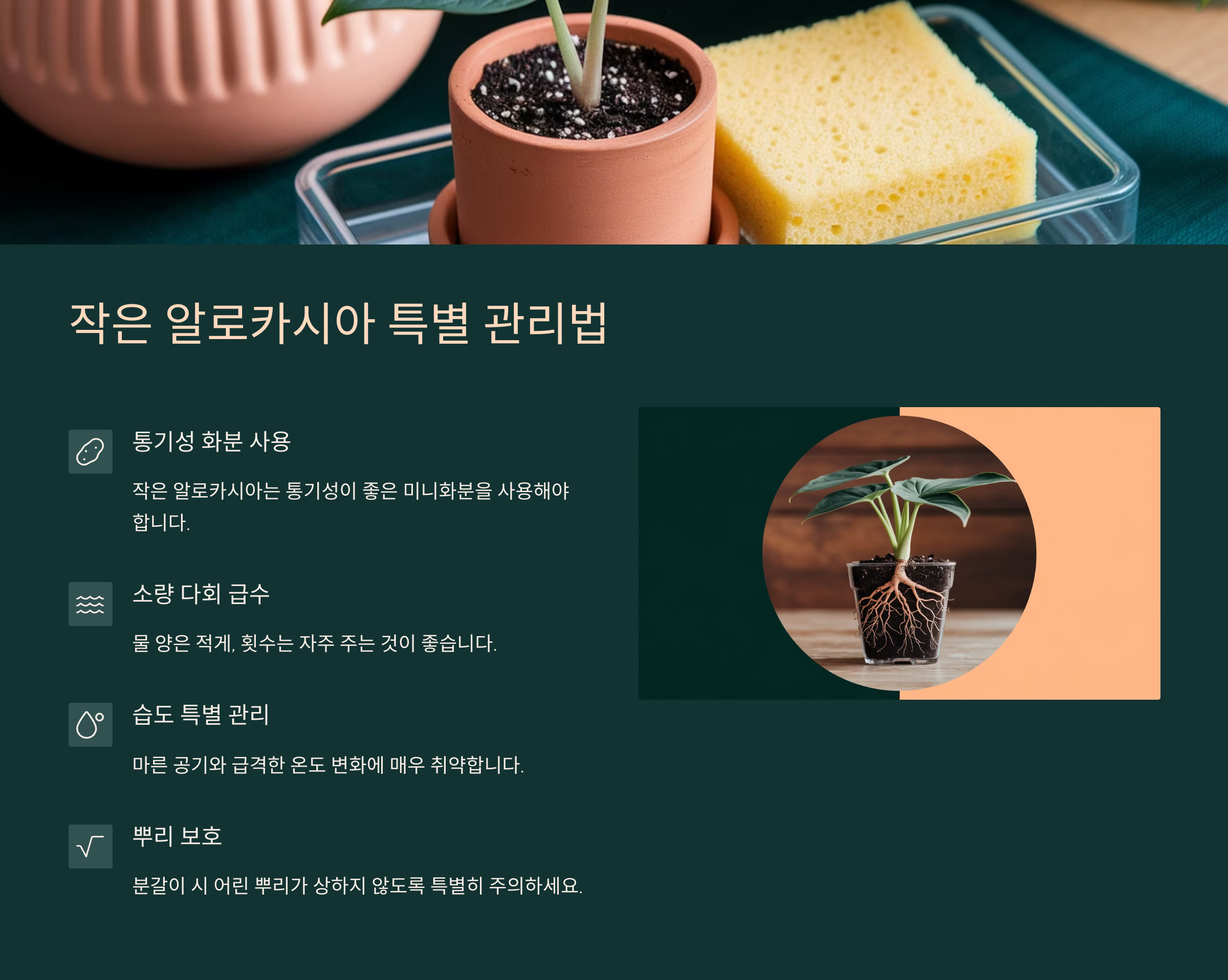 작은 알로카시아는 큰 친구들과 관리법이 조금 달라요! 몸집이 작을수록 뿌리와 잎이 민감해서, 물주기도 훨씬 더 세심한 주의가 필요해요. 👶