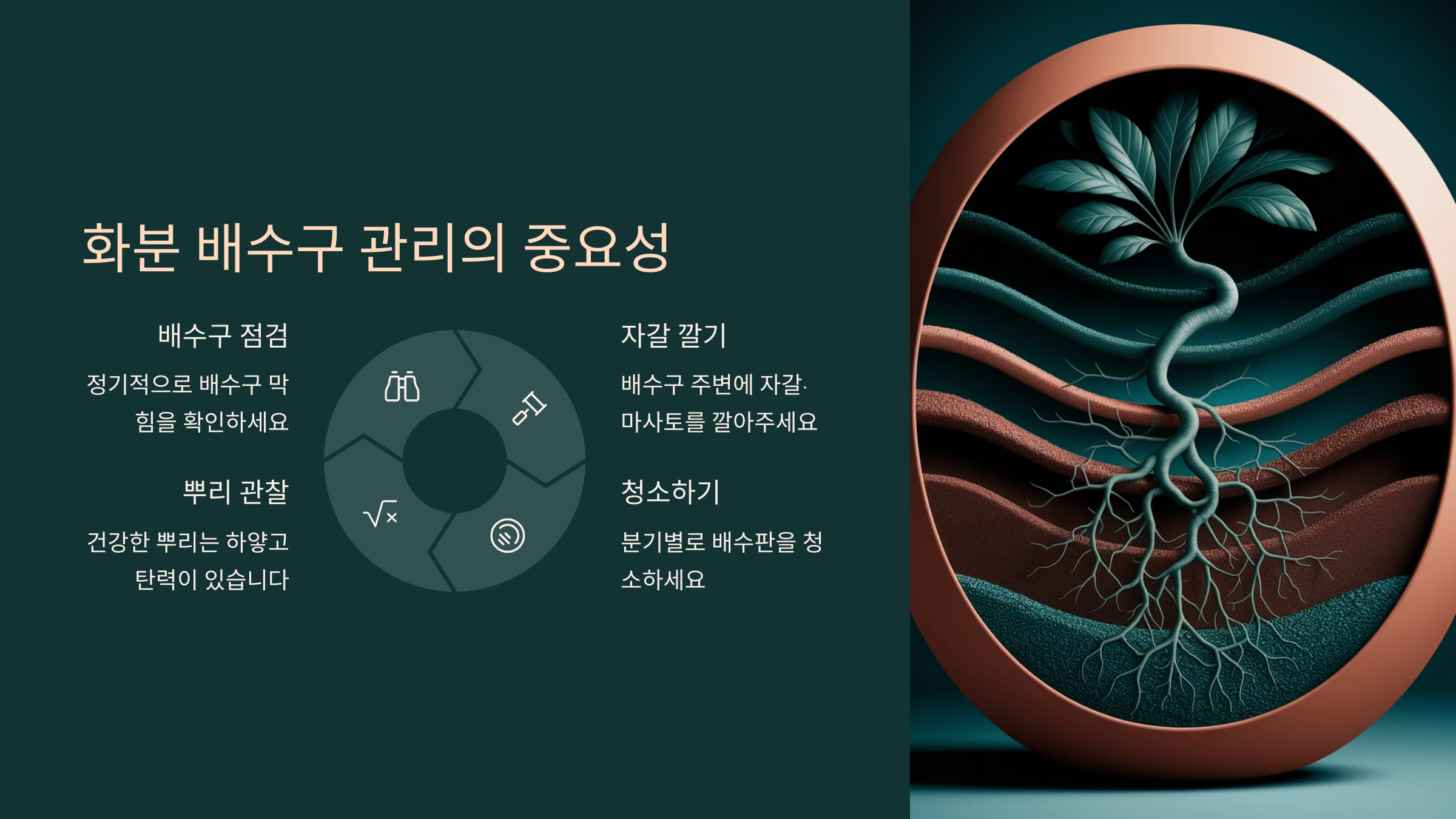 비 오는 기간이 길어지면, 화분 배수 상태를 꼭 체크해야 해요. 배수구가 막히면 화분 안에 물이 고이게 되고, 이는 뿌리 부패로 이어질 수 있으니까요. 장마철에는 특히 배수 체크를 게을리하지 말아야 해요! 🛠️
