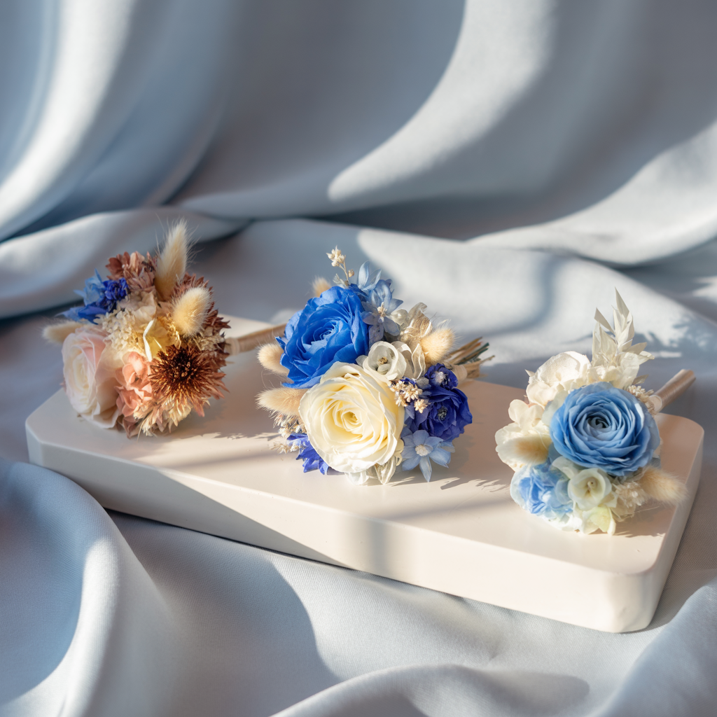 첫 번째 팁은 '소재를 다르게 선택하기'예요. 일반 생화 대신 드라이플라워, 프리저브드 플라워, 심지어 나뭇잎과 베리류를 믹스한 코사지도 요즘 핫하답니다.