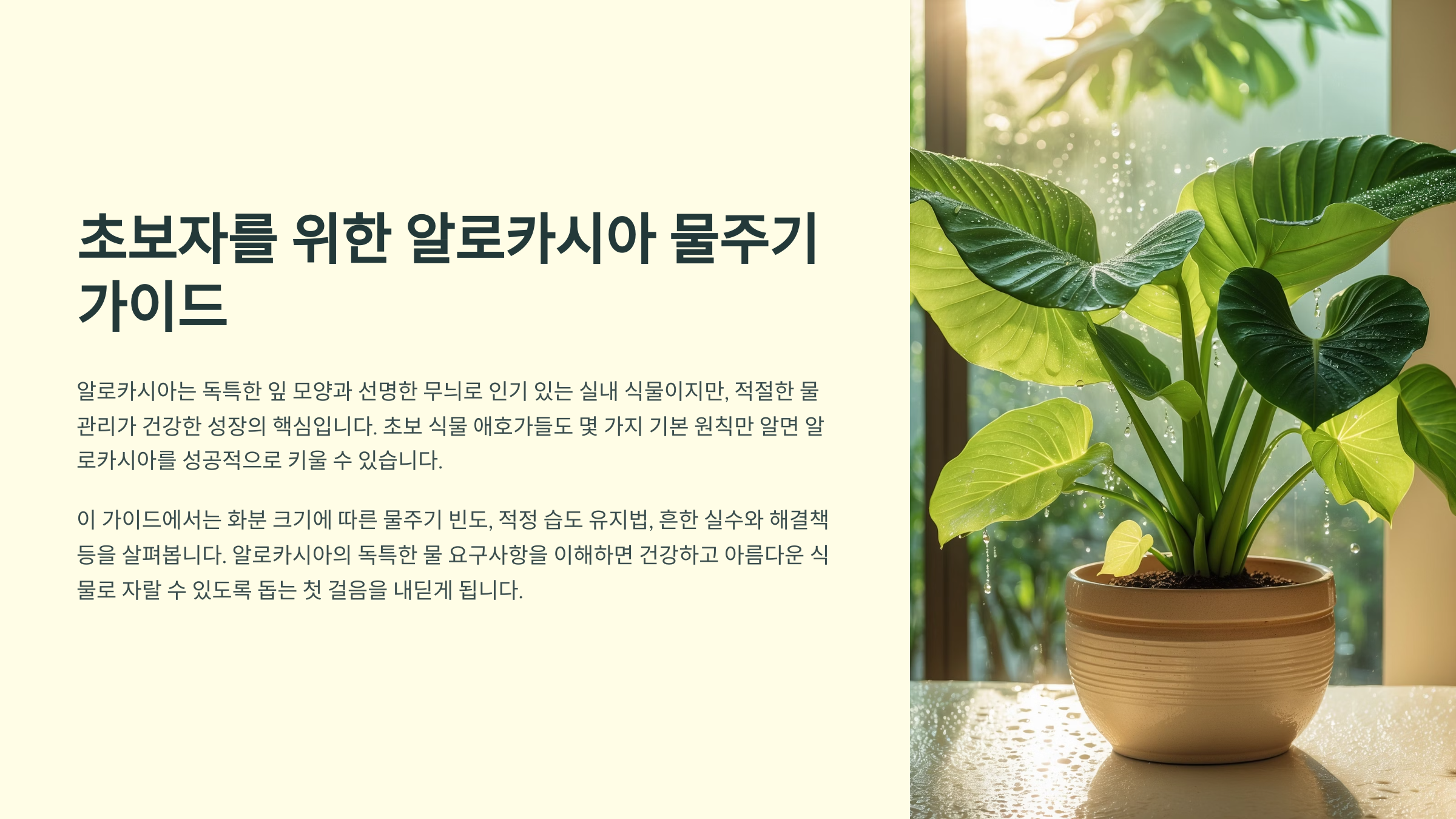 알로카시아는 독특한 잎 모양과 이국적인 분위기로 많은 사람들의 사랑을 받는 실내식물이에요. 하지만 예민한 성격 덕분에 물을 잘못 주면 바로 시들어버리거나 뿌리가 썩기 쉬운 친구랍니다. 초보자라면 알로카시아의 물관리에 대해 제대로 이해하는 것이 정말 중요해요!