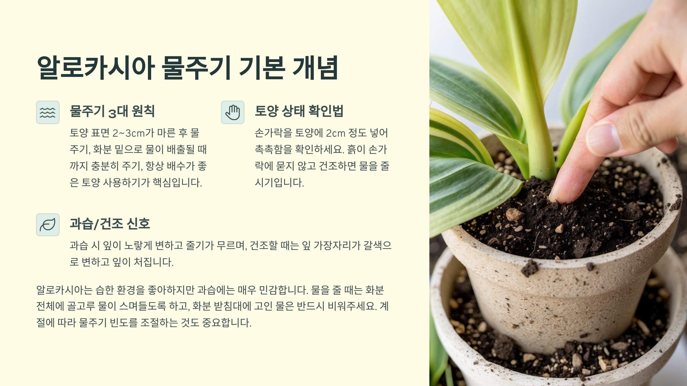 알로카시아는 열대 우림이 원산지인 만큼 습도와 수분에 매우 민감한 식물이에요. 그렇기 때문에 단순히 '일주일에 한 번' 같은 규칙적인 물주기보다는, 토양의 상태를 보고 결정하는 것이 중요하답니다. 초보자라면 이 기준부터 제대로 익혀야 실패 확률을 줄일 수 있어요.