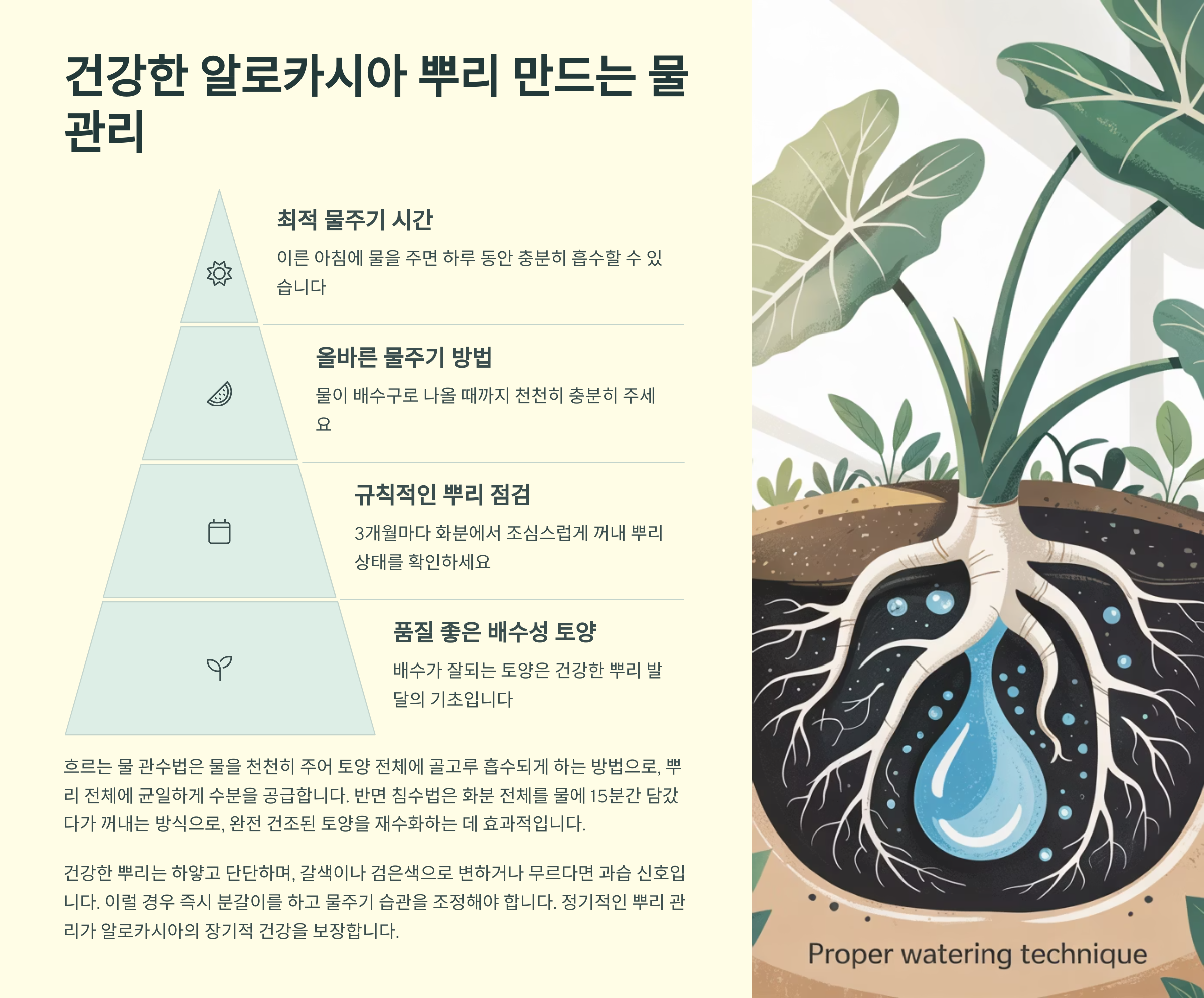 알로카시아를 튼튼하게 키우기 위해 가장 중요한 건 건강한 뿌리를 유지하는 거예요. 뿌리가 건강해야 잎도 크고 선명하게 자라고, 새순도 잘 올라오죠. 물을 어떻게 주느냐에 따라 뿌리의 형태와 강도가 완전히 달라지기 때문에 물관리 방식은 정말 핵심이에요.