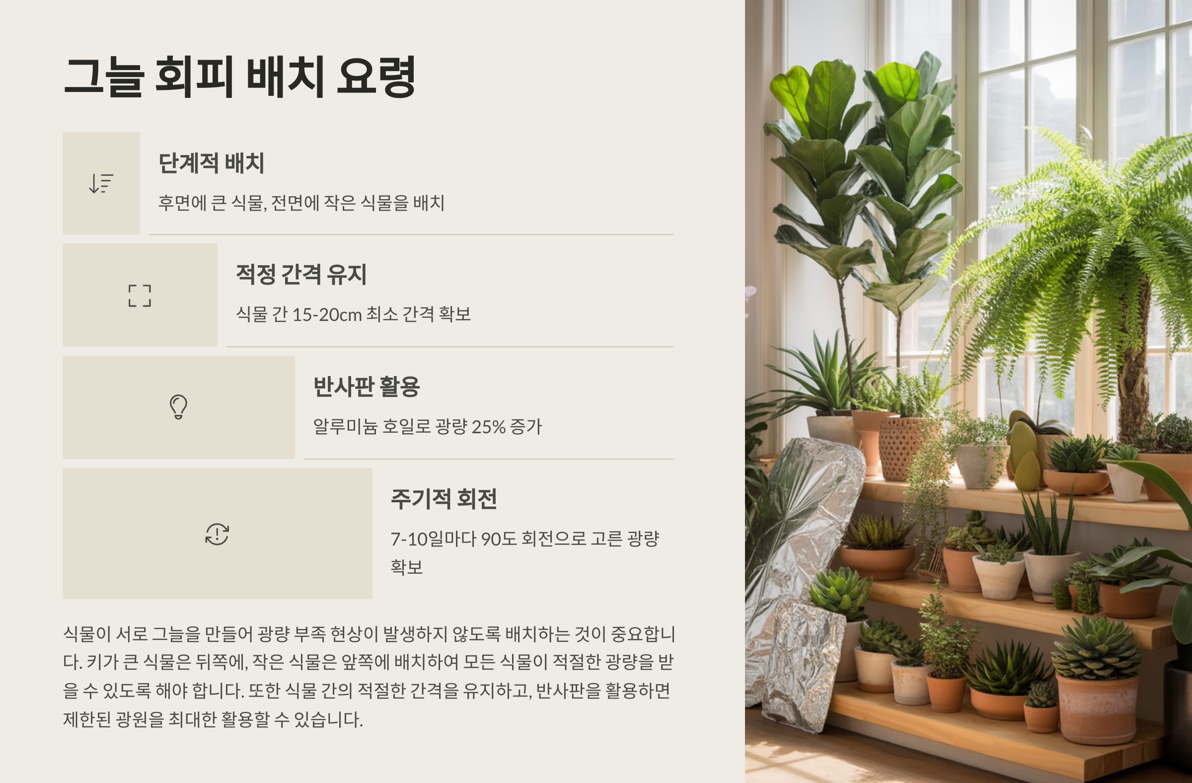 | 높이 조절 | 선반/받침대 활용 | 빛 차단 구조물 피함 |