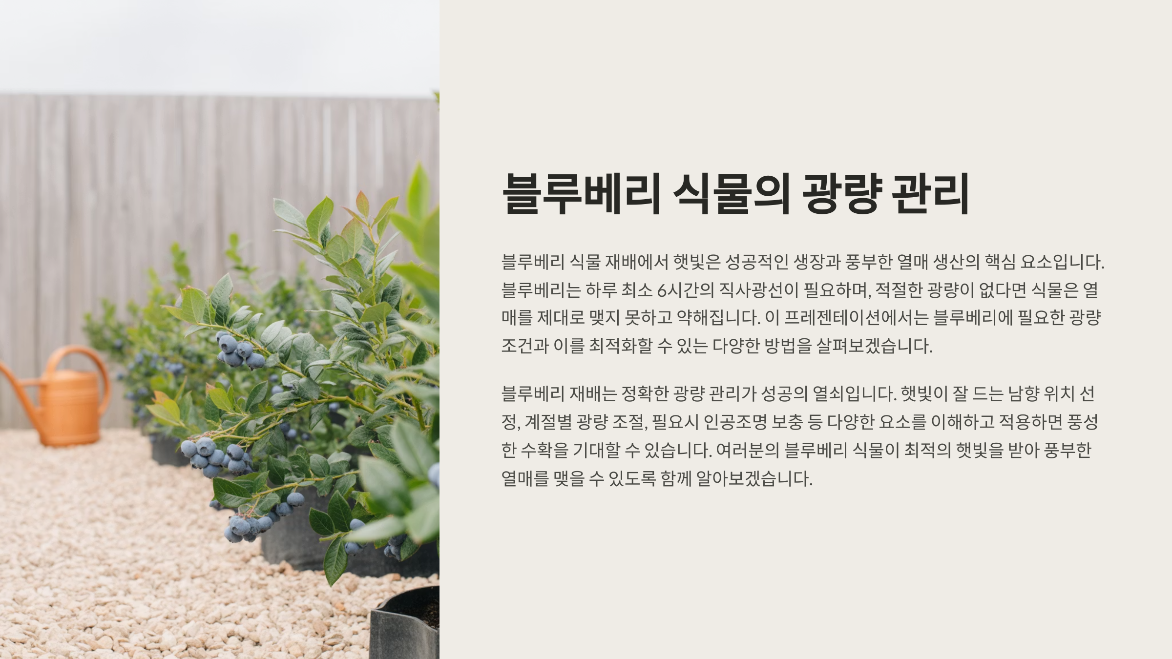 블루베리는 일조량에 민감한 과일이에요. 햇빛이 부족하면 광합성 효율이 떨어져 성장 속도가 둔화되고, 열매가 작거나 아예 열리지 않을 수 있어요. 특히 수확기에 접어들 무렵 충분한 햇빛을 받지 못하면 당도와 색깔까지 영향을 받아 상품성이 떨어지게 돼요.