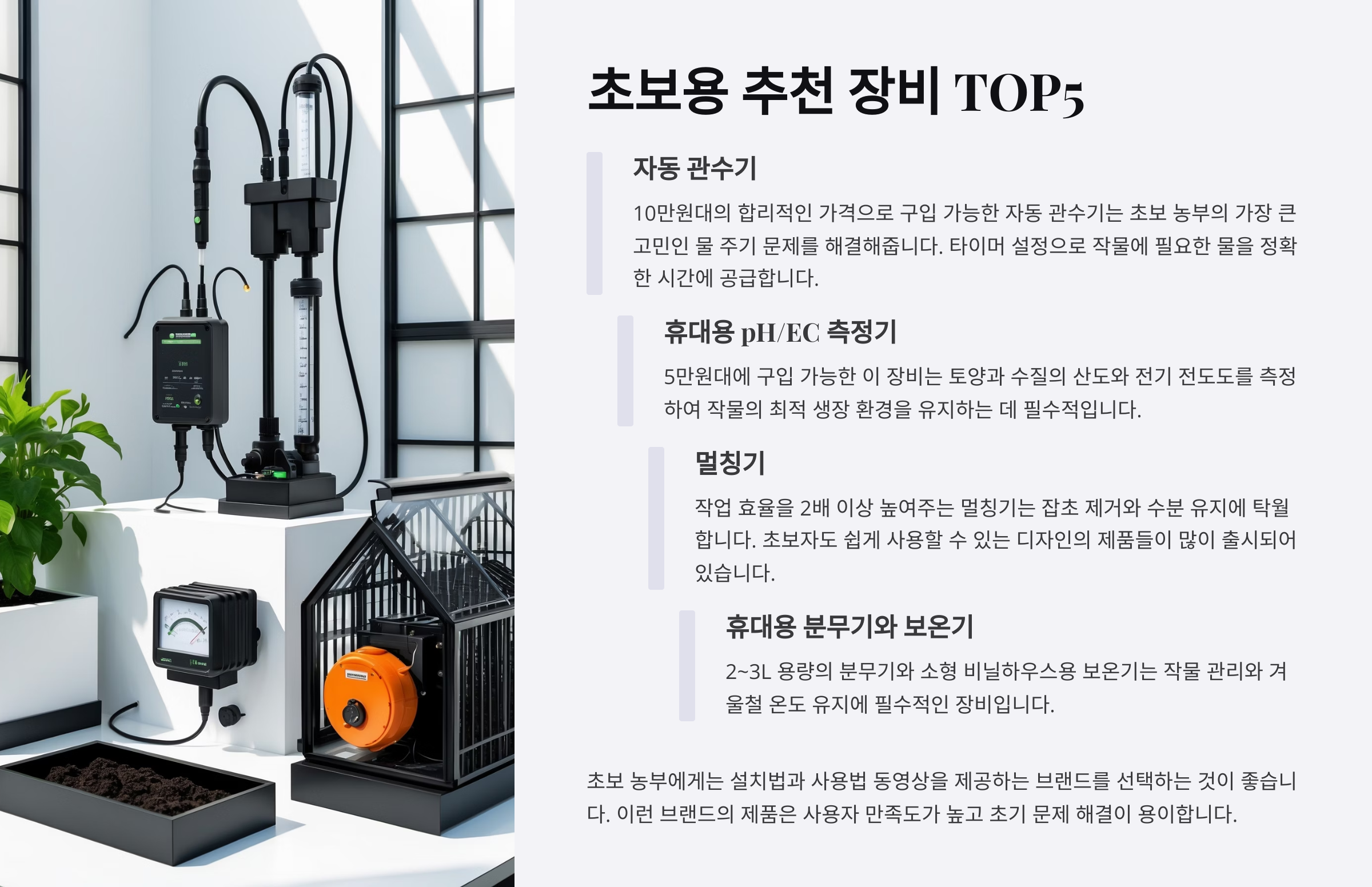 초보자라면 처음부터 많은 장비를 사기보다, 꼭 필요한 기본 장비 위주로 시작해서 재배 규모가 늘어날 때 자동화나 전동 도구를 추가하는 게 좋아요. 장비 하나하나가 재배 성패를 좌우할 수 있기 때문에 제대로 고르는 게 중요해요.