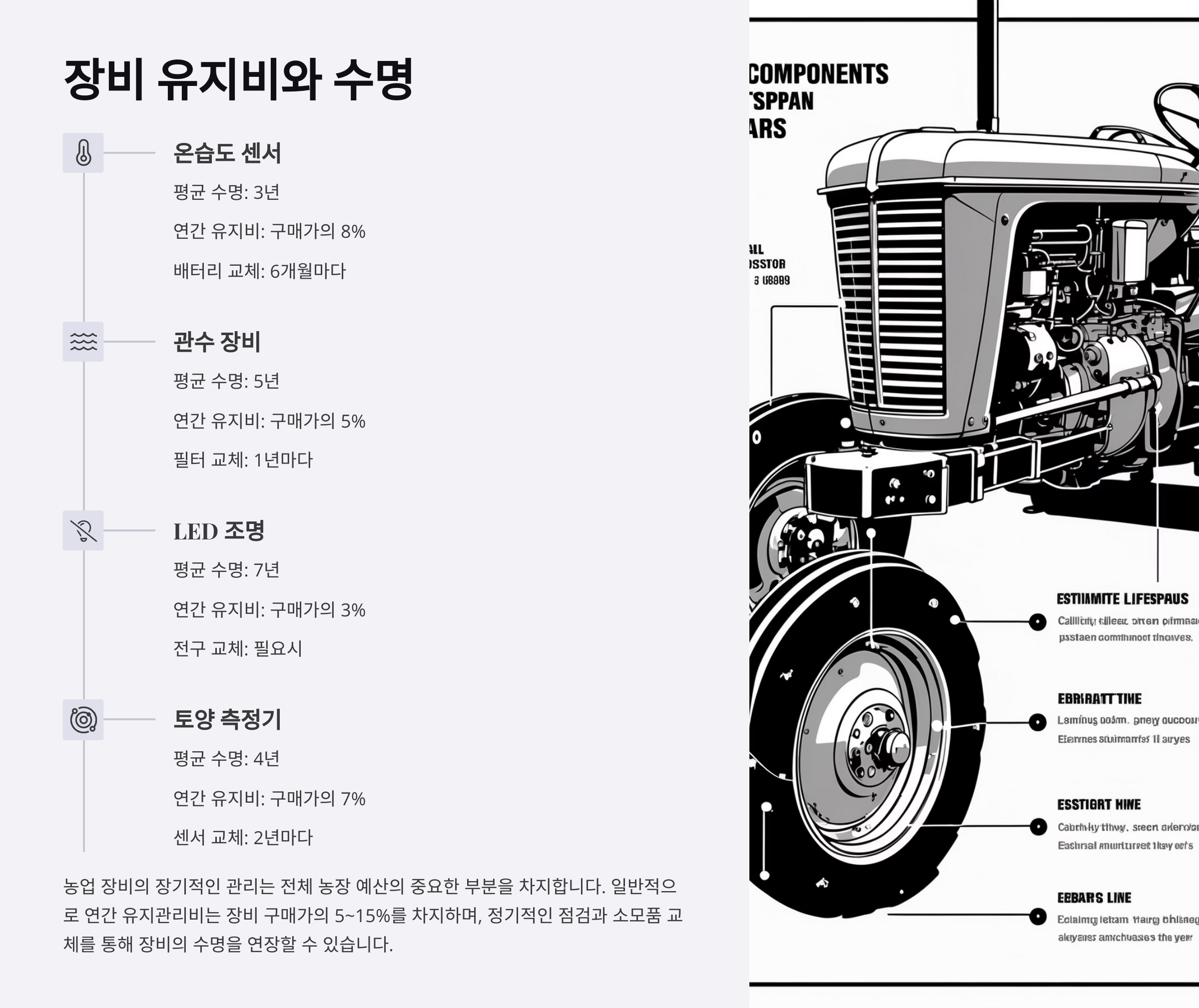 블루베리 재배 장비는 처음 구매할 때보다, 쓰면서 유지·관리하는 데 드는 비용도 무시할 수 없어요. 특히 자동화 장비나 전동 도구는 고장이 날 경우 수리나 부품 교체 비용이 만만치 않기 때문에 수명과 유지비를 미리 알아두는 게 중요해요.
