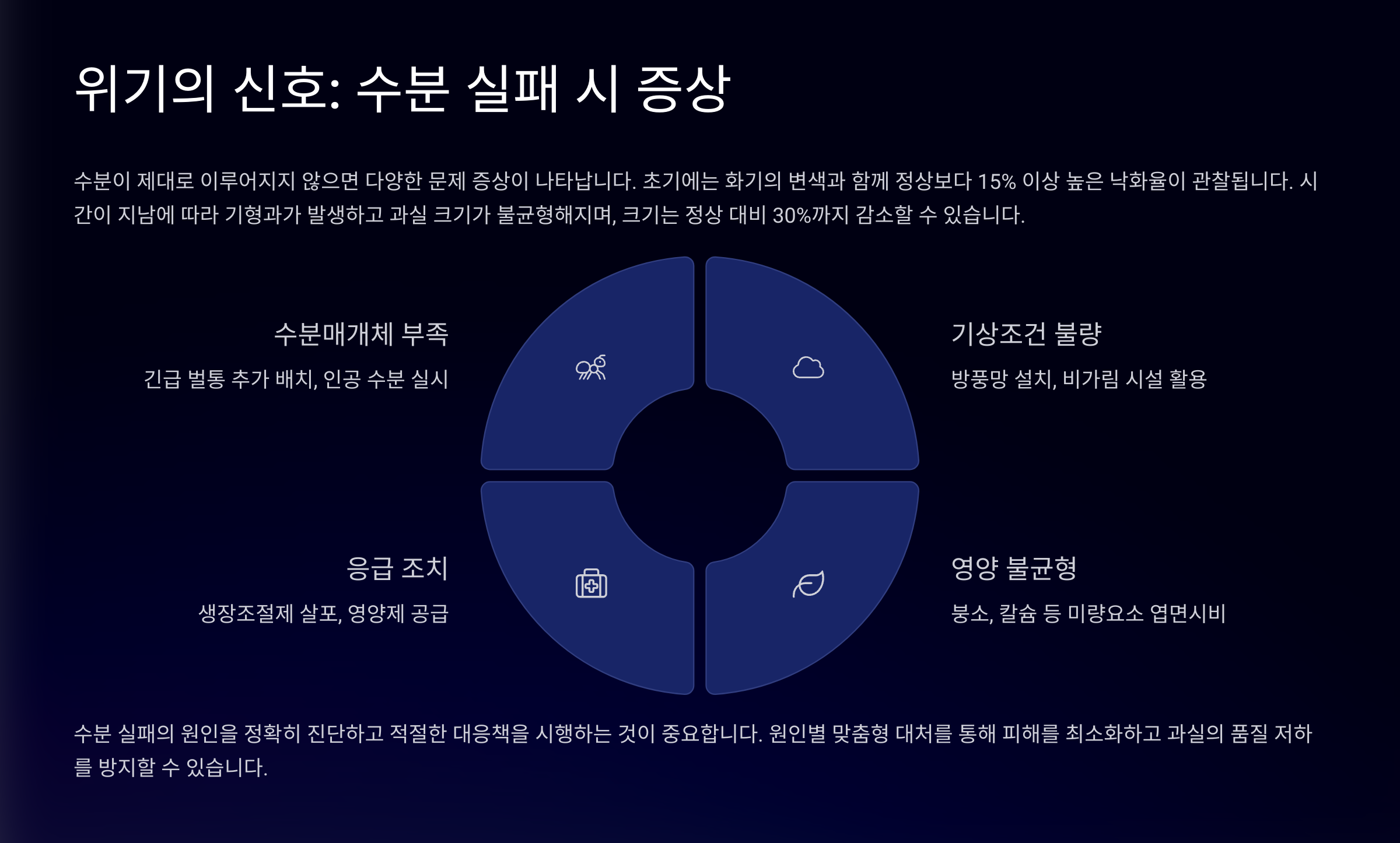 | 병해 예방 | 열매 변형 방지 | 살균제 타이밍 중요 |