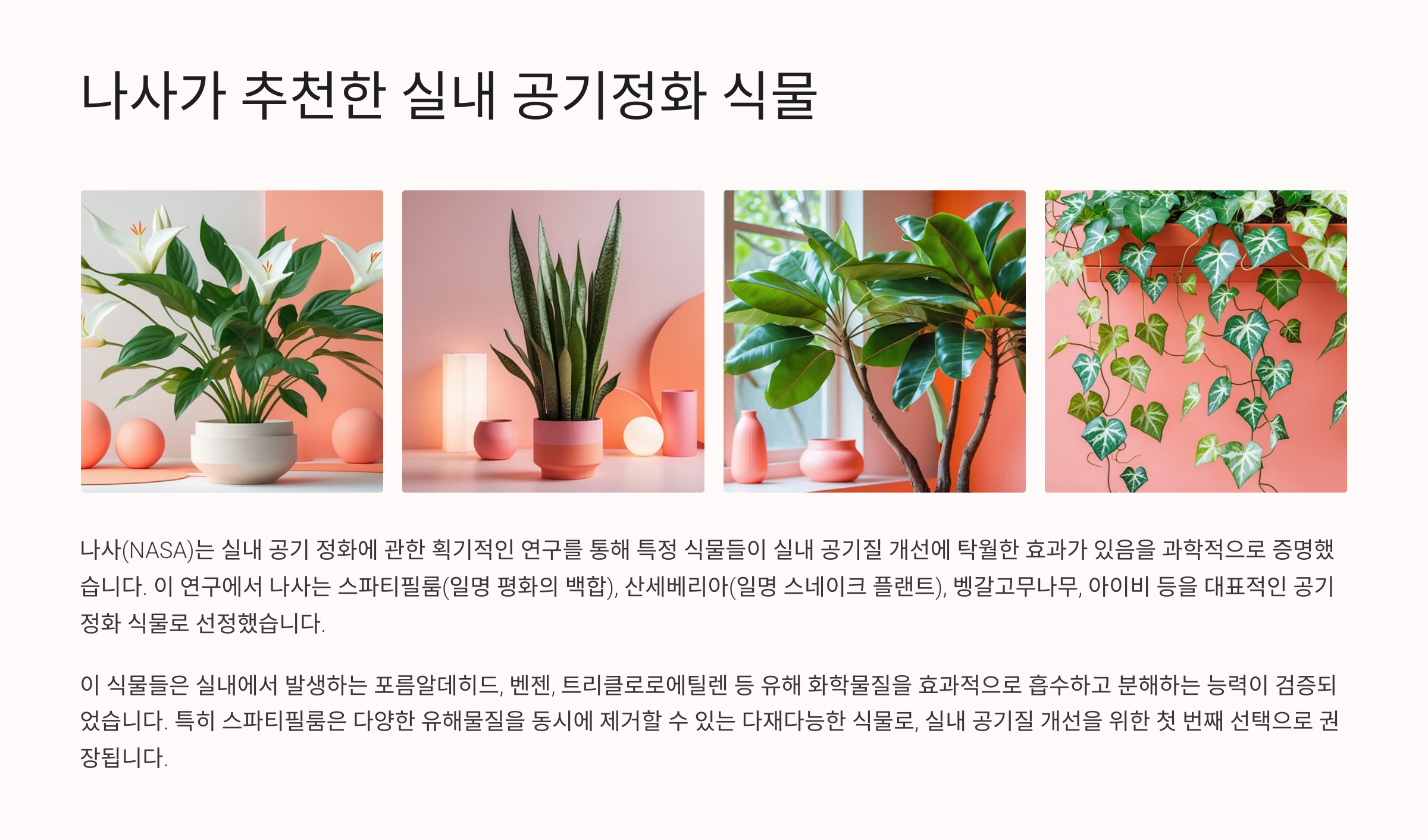 NASA의 기준은 단순히 오염물질 제거량뿐 아니라, 유지 관리의 쉬움, 실내 생존 가능성, 인체 무해성 등도 함께 고려됐어요. 그래서 우리가 실생활에서 키우기 좋은 식물들이 리스트에 오른 거랍니다.