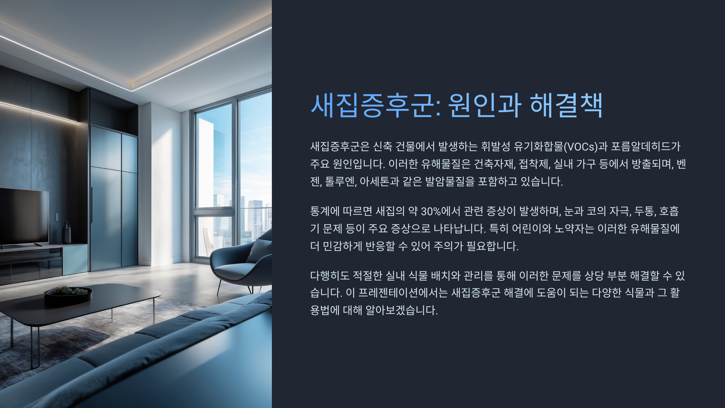 새 아파트나 리모델링을 마친 공간에 처음 들어섰을 때 특유의 냄새가 느껴지죠? 그 냄새가 바로 새집증후군의 신호일 수 있어요 🏠 많은 사람들이 인테리어를 마친 후 어지러움, 두통, 눈 따가움 등을 호소하는데요, 이는 실내 공기 중 떠다니는 유해물질 때문이에요.