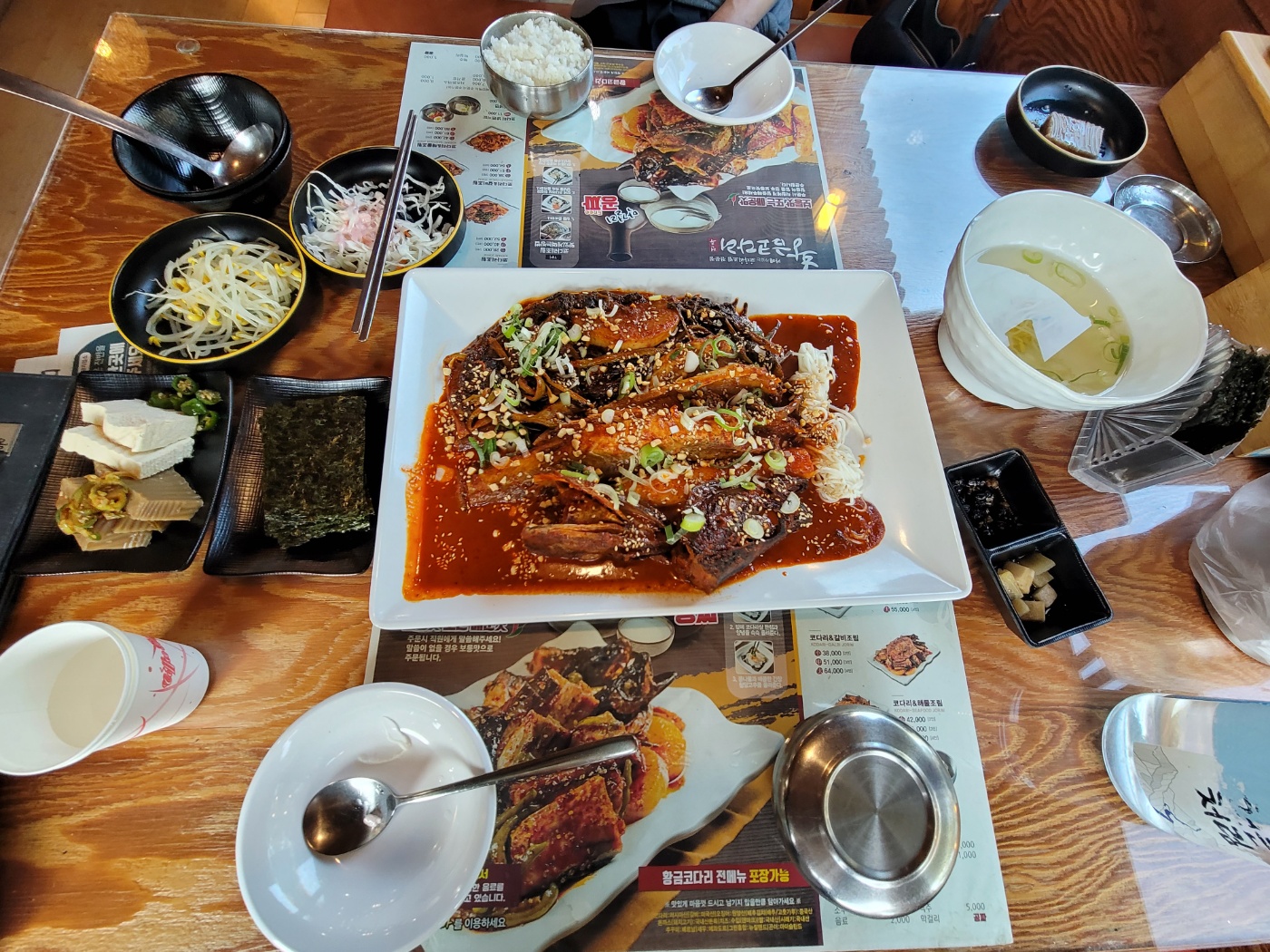 테이블에 앉으면 바로 기본 반찬이 차려지는데, 하나같이 정갈하고 맛이 깊어요. 열무김치, 도라지무침, 다시마초무침 등 흔치 않은 반찬 구성이라 오히려 신선했어요. 특히 열무김치는 깔끔하면서도 시원한 맛이 황금코다리 조림의 매운맛을 중화시켜주는 역할을 톡톡히 해줘요.