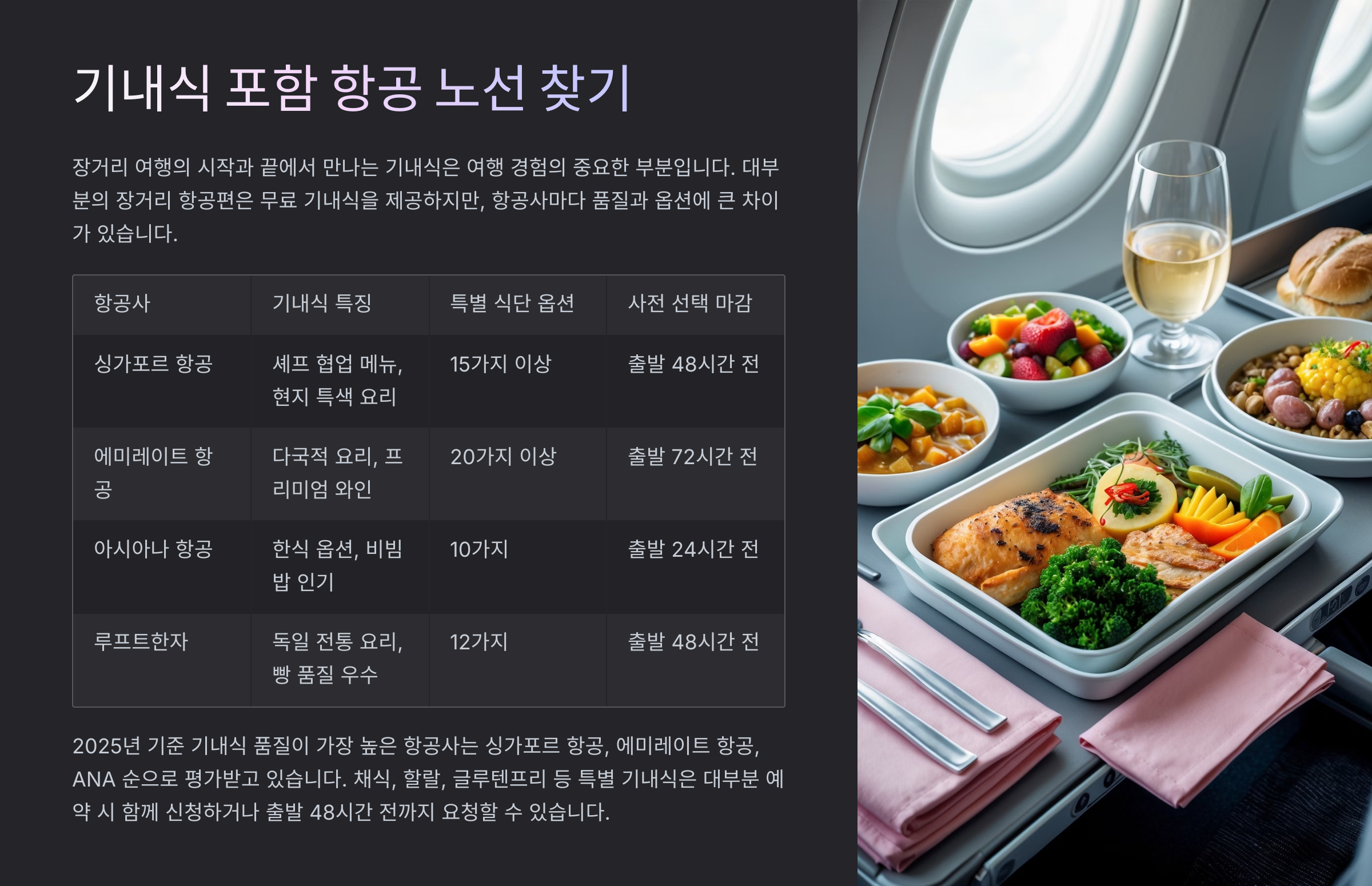팁 하나 더! 일부 항공사는 ‘기내식이 맛있기로 유명’하답니다. 예를 들어 대한항공의 비빔밥, 싱가포르항공의 라크사, 에미레이트항공의 아랍식 커리가 대표적이에요. 맛도 챙기고, 비용도 아끼고, 비행도 더 즐거워지죠.