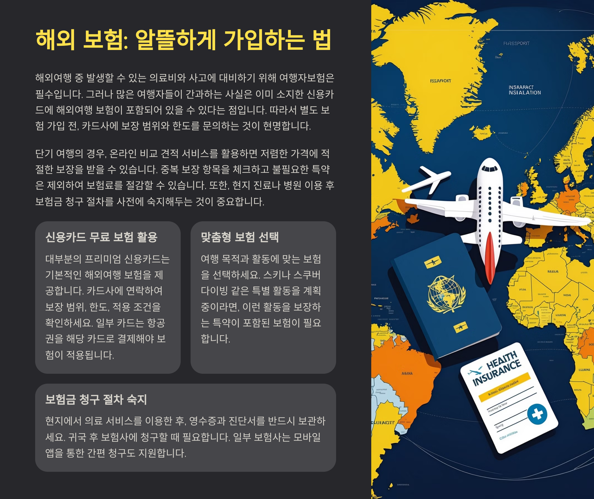 보험을 고를 땐 보장 내용이 중요한데요, 질병·상해 치료비, 배상 책임, 항공 지연/수하물 분실 보장이 포함되어 있는지를 체크하세요. 특히 유럽여행 시에는 '솅겐보험'이라 불리는 일정 기준을 만족해야 입국이 가능해요.