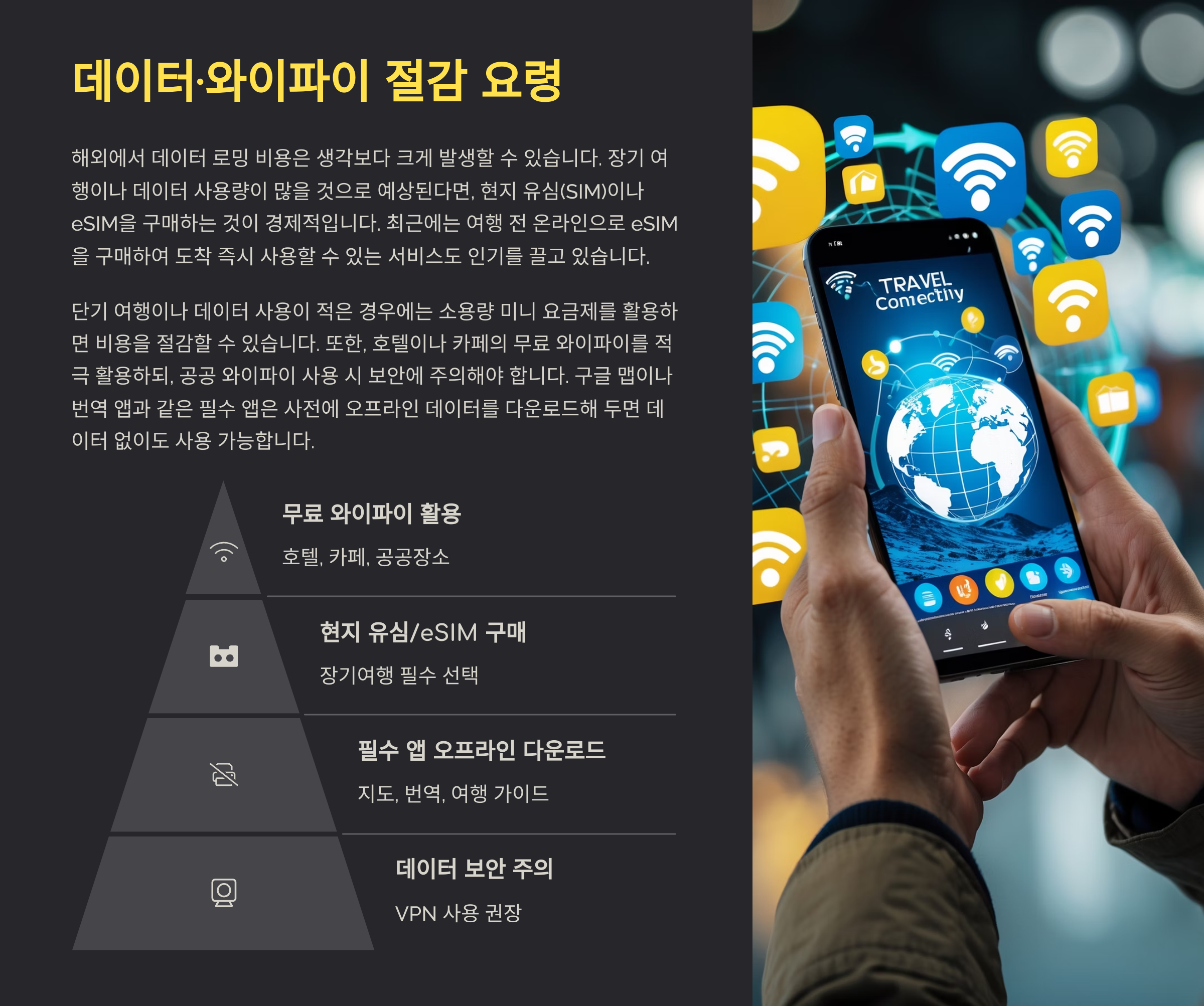 해외에서 데이터를 마음껏 쓰려면 요금 걱정부터 생기죠. 하지만 방법만 잘 알면 로밍보다 훨씬 저렴하게, 때로는 무료로 인터넷을 사용할 수 있어요. 요즘은 여행 중 구글맵, 번역 앱, SNS 업로드까지 데이터가 필수니까 꼭 챙겨야 해요!