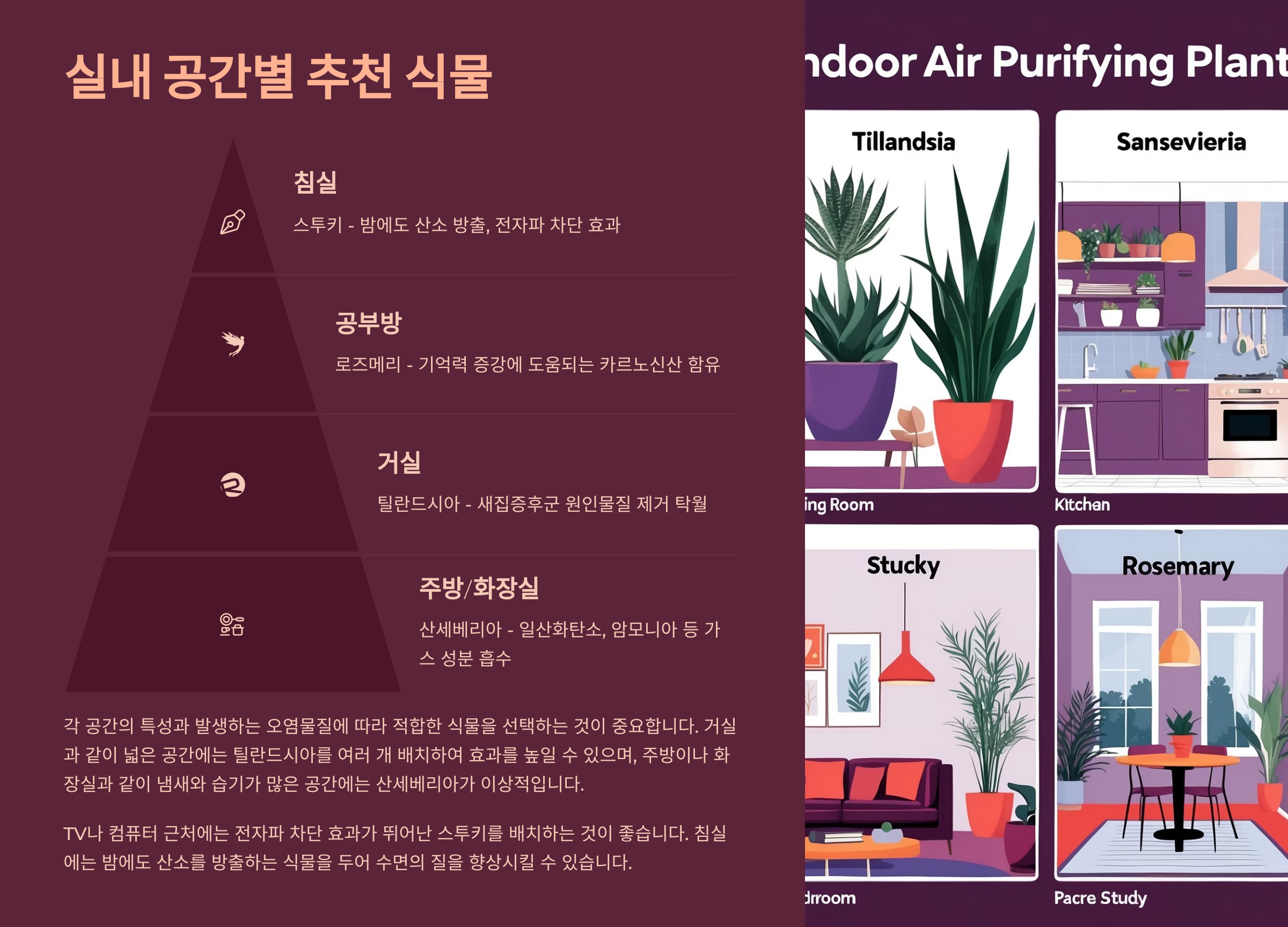 | 침실 | 산세베리아 | 야간 산소 배출, 숙면 도움 |