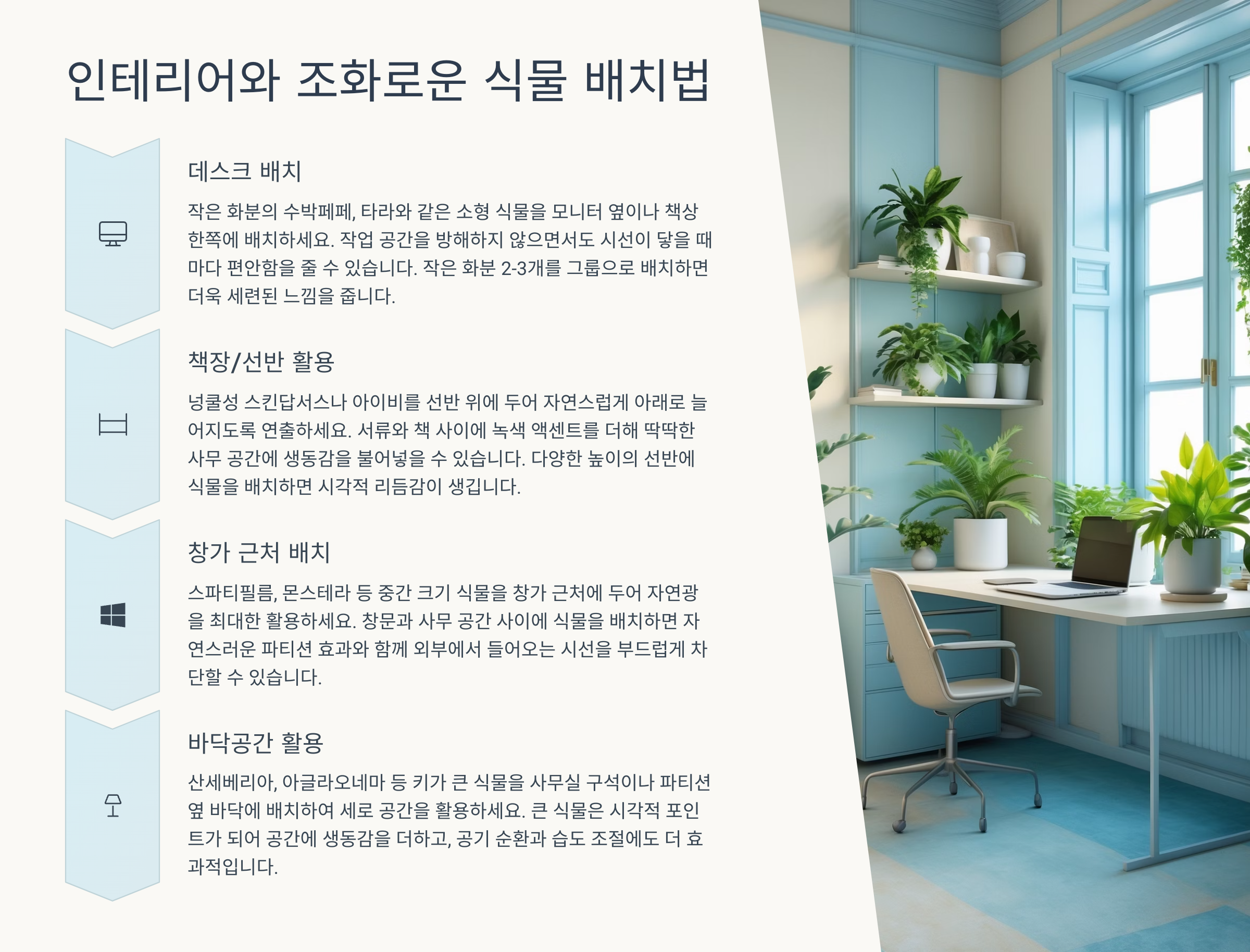 사무실에 식물을 들일 때는 기능만큼이나 ‘어떻게 보일까?’도 중요하죠. 식물 하나만 잘 선택해도 공간이 세련되고 생기 있어 보여요. 특히 깔끔한 오피스 인테리어와 조화롭게 어울리는 식물 조합을 고르면 업무 환경이 훨씬 쾌적해진답니다. 🌱