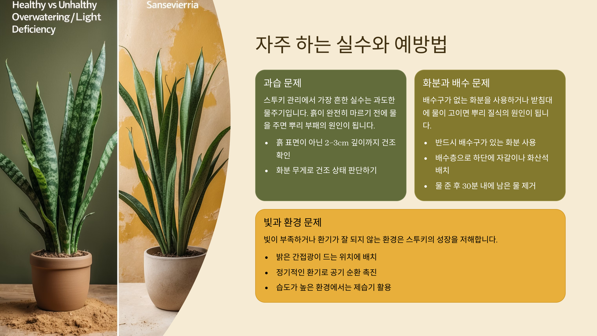 | 잘못된 흙 사용 | 다육 전용 흙, 마사토 활용 |