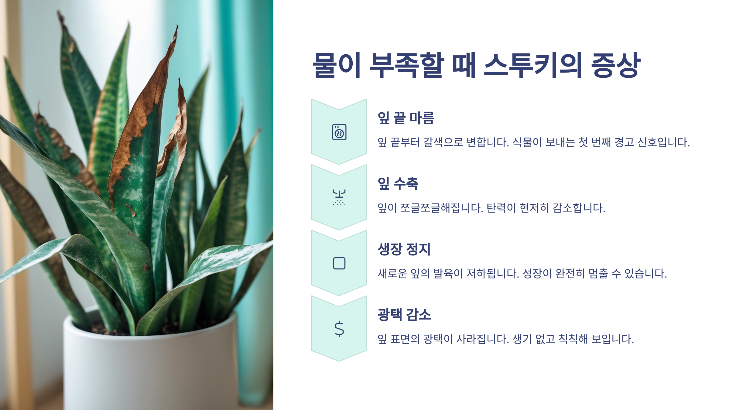 하지만 아무리 강인한 식물이라도 물이 너무 부족하면 다양한 신호를 보내요. 오늘은 스투키가 우리에게 보내는 '물이 부족해요!'라는 신호들을 하나씩 알아볼게요. 놓치지 말고 꼭 챙겨봐야 해요!