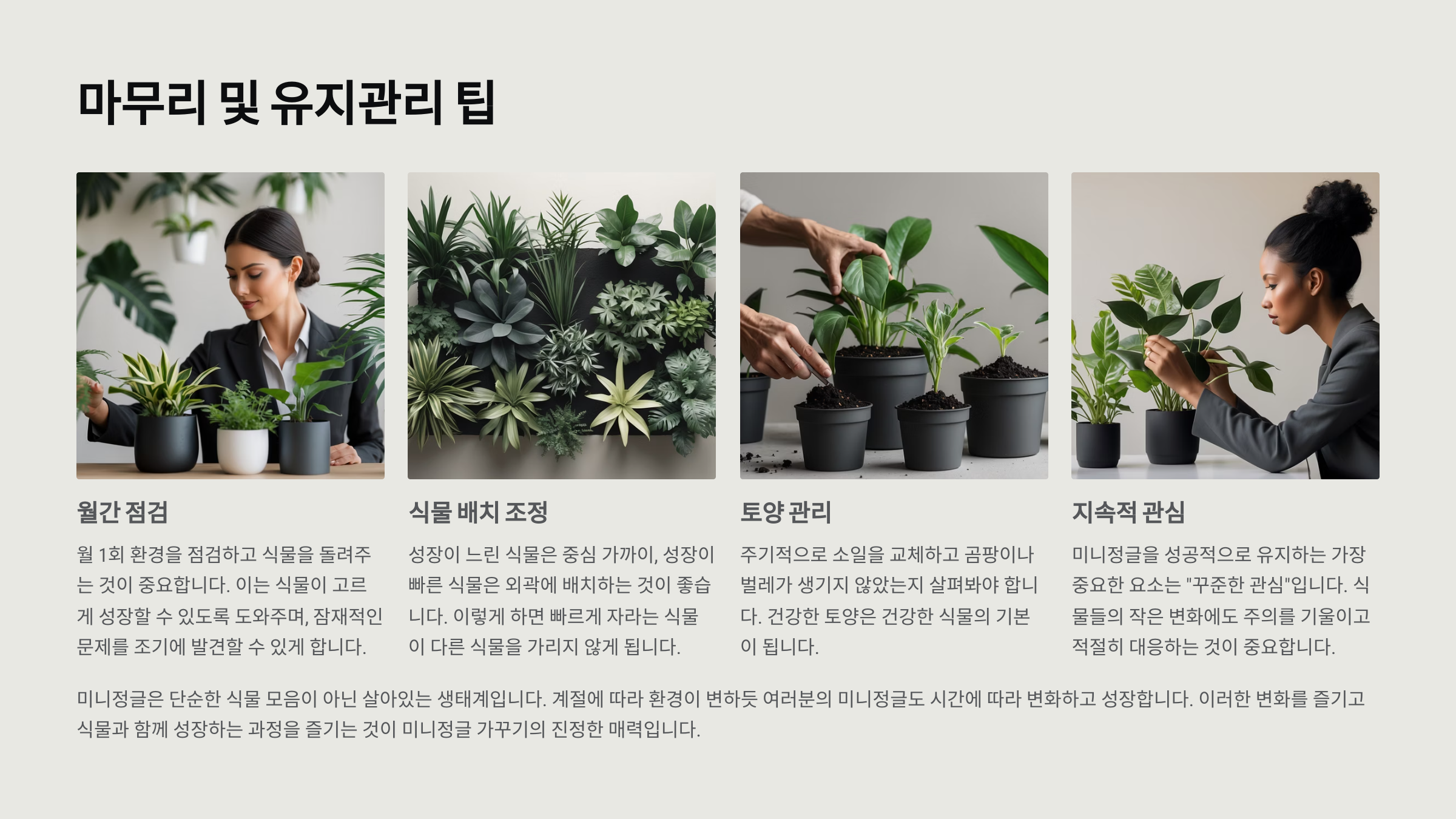 조화로운 조합을 만들기 위해 식물의 성장 속도도 고려하는 게 좋아요. 성장 속도가 빠른 식물 옆에 느린 식물을 두면 금방 비율이 깨질 수 있거든요. 정기적으로 분갈이와 위치 조정도 필요하답니다.