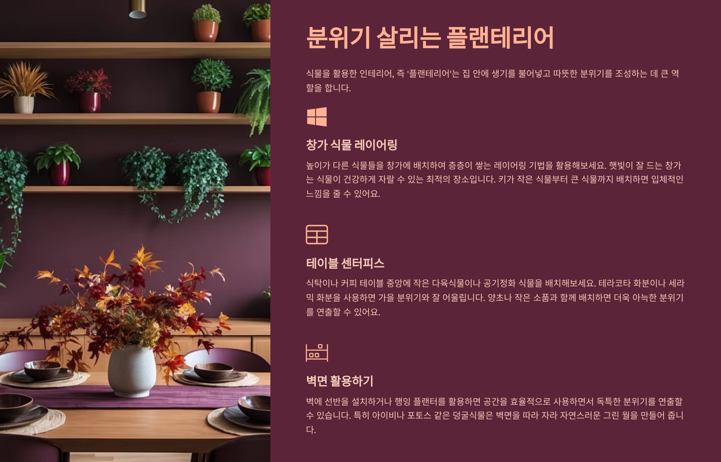 | 플랜테리어 유형 | 추천 식물 | 포인트 |