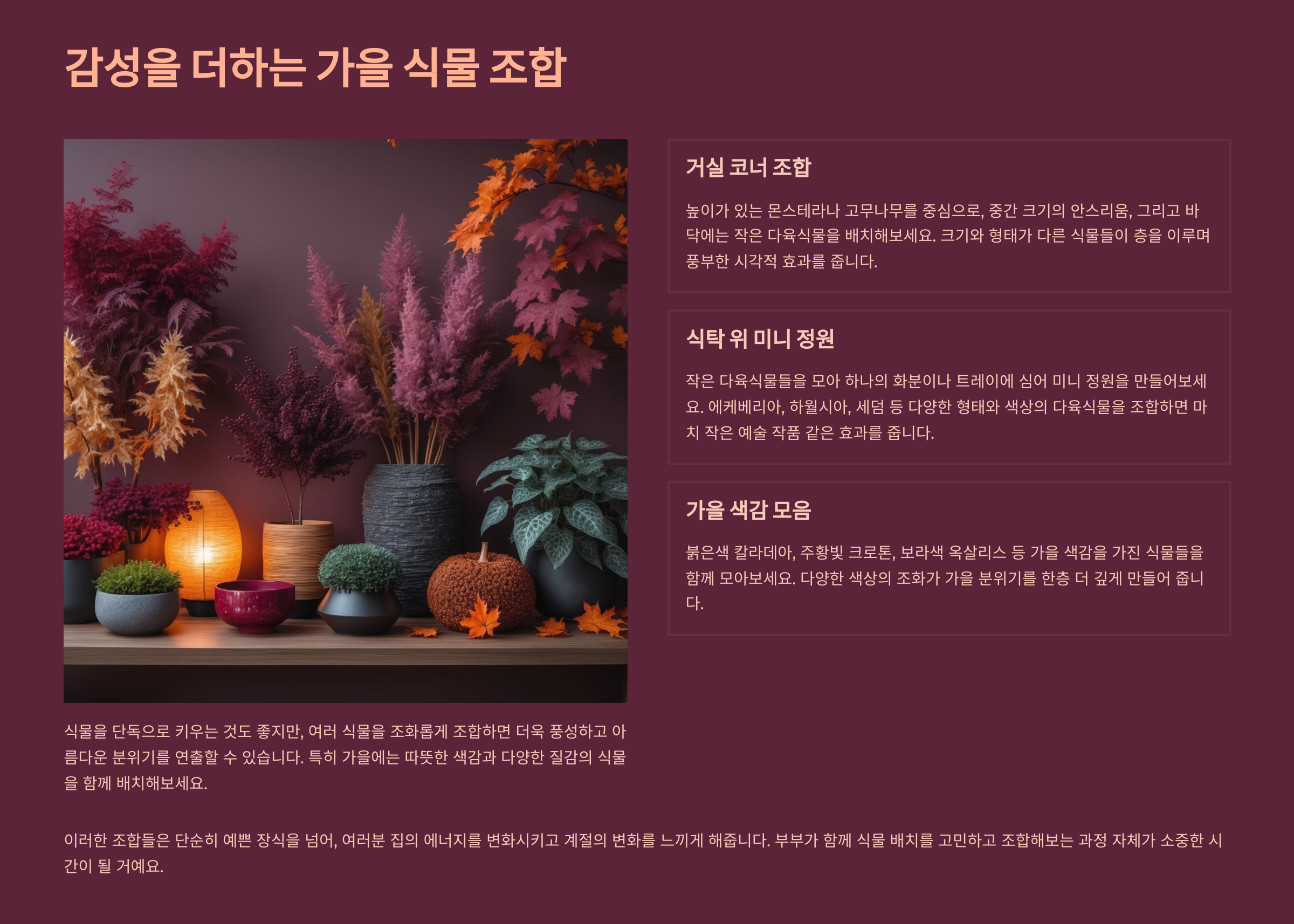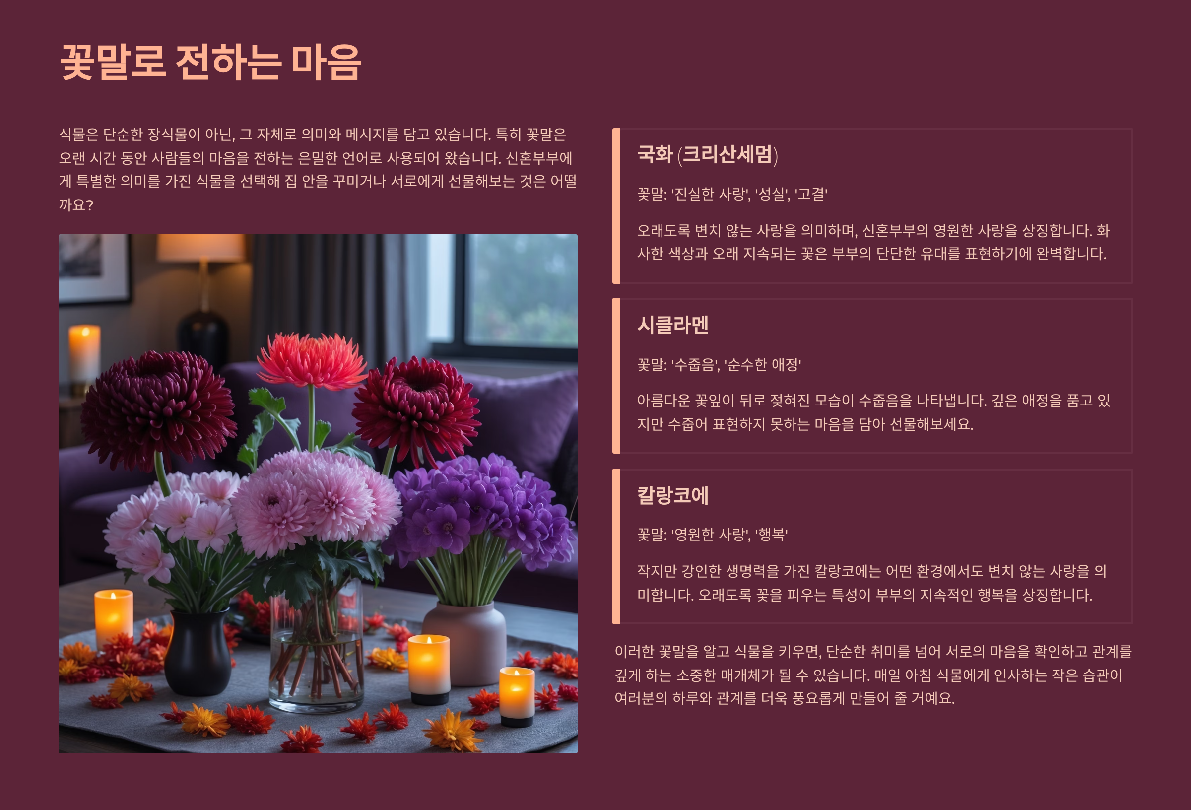 이렇게 다양한 가을 화초들은 각각의 매력과 특징을 가지고 있어서, 신혼 부부의 취향에 맞게 골라 배치하면 집 안 전체 분위기가 훨씬 아늑해지고 감성적으로 변해요. 🌱