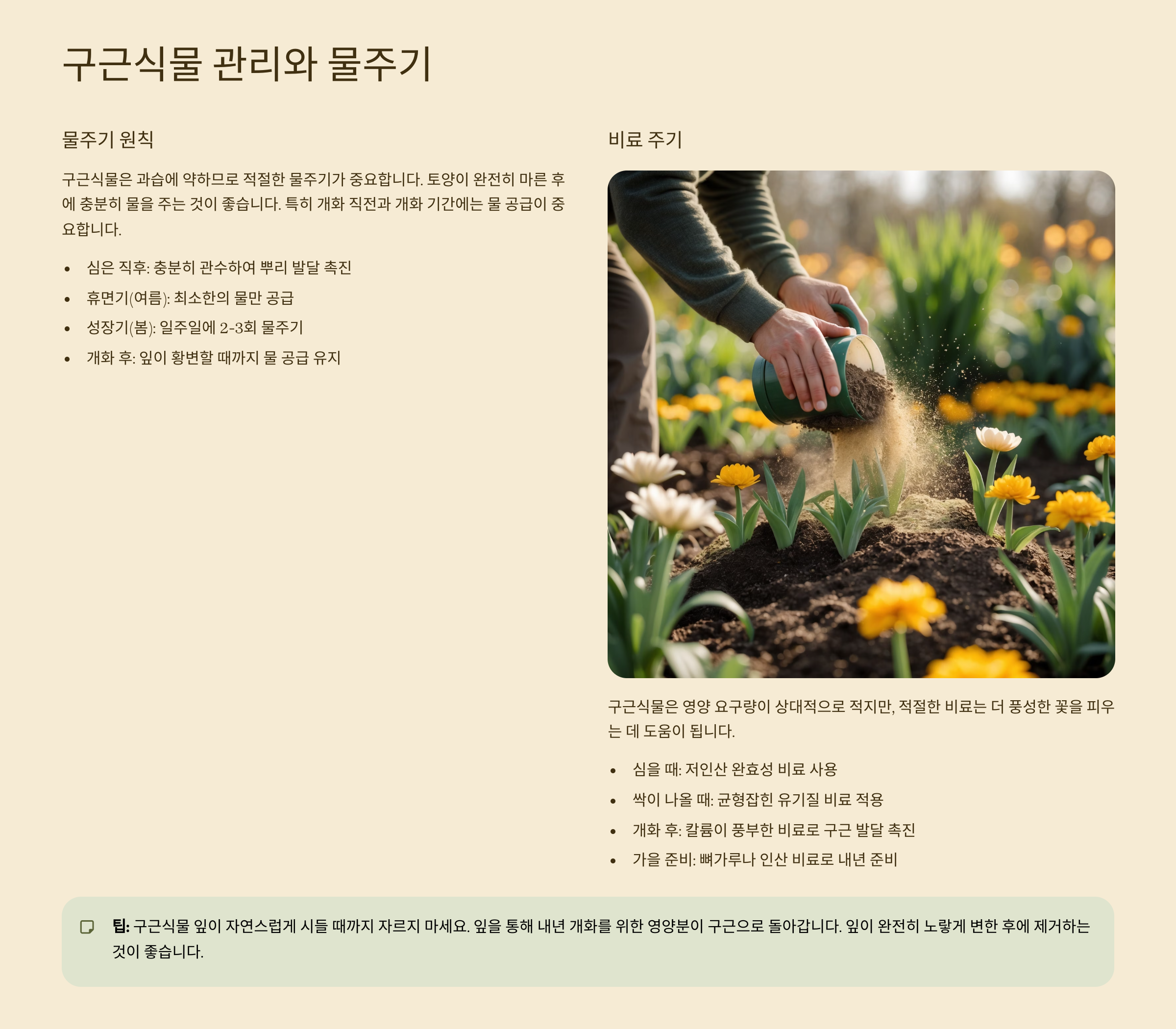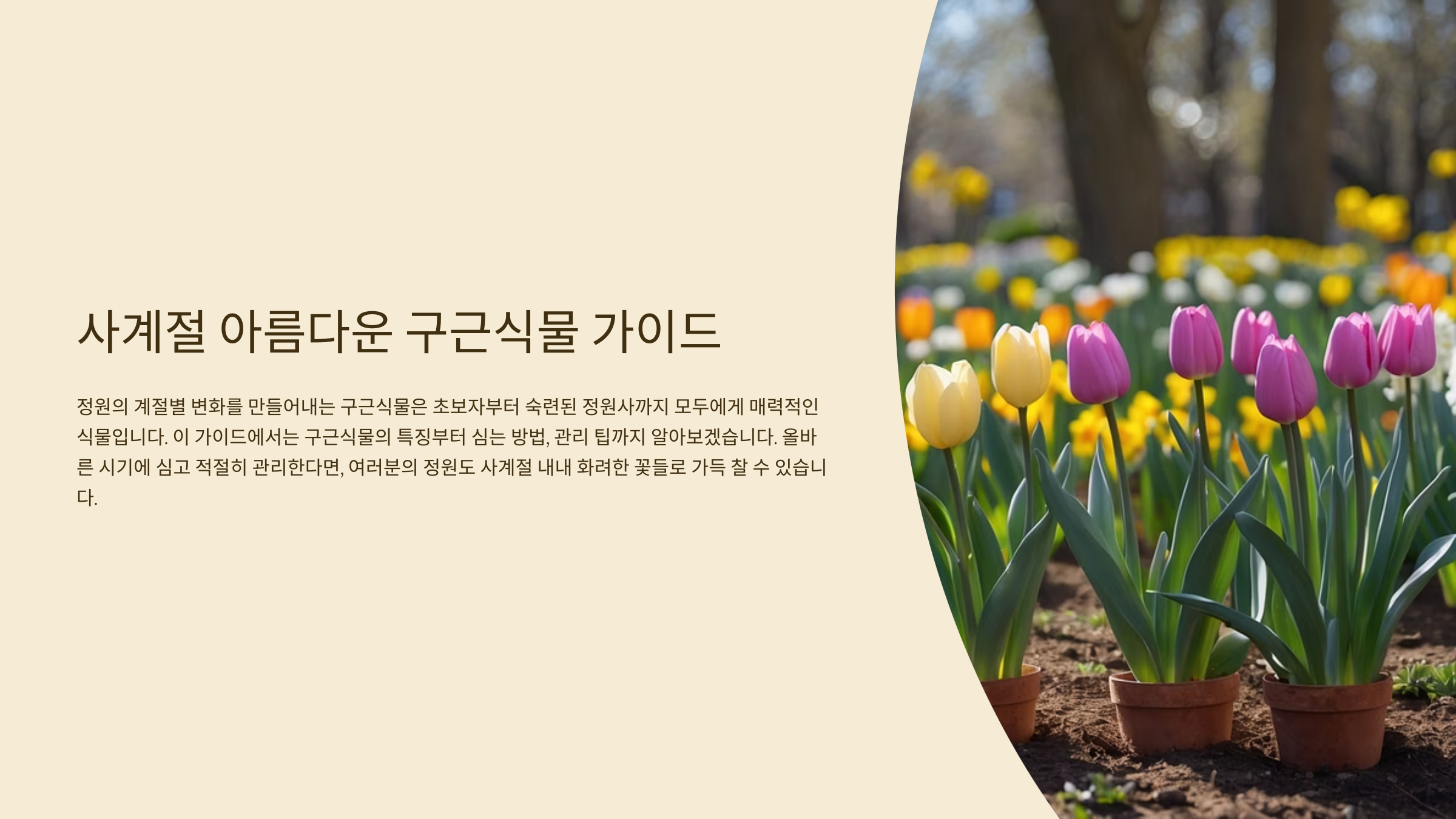 제가 처음 구근식물을 키웠을 때도 가을부터 꼼꼼히 심고 준비했었어요. 나의 느낌으로 말하자면, 겨울 동안 아무 일 없는 듯하지만 봄이 되면 화려하게 피어나는 모습을 볼 때 정말 보람을 느꼈답니다. 그럼 지금부터 가을에 심어야 할 구근식물과 관리법을 자세히 알려드릴게요!