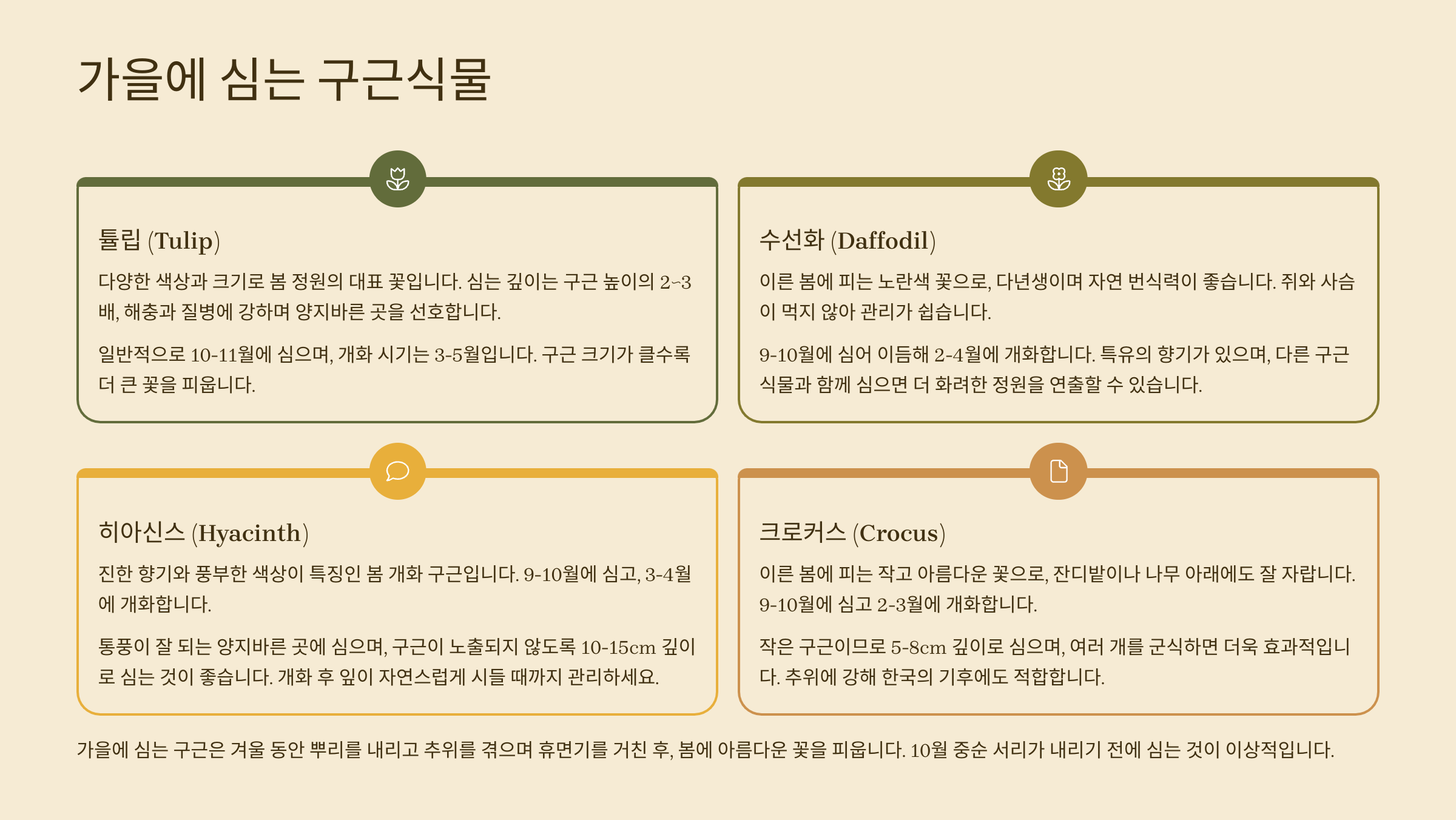 봄 정원을 아름답게 채우고 싶은 분들이라면 지금부터 준비가 필요해요. 바로 가을에 구근식물을 심어두면, 이듬해 봄 멋진 꽃들을 만날 수 있거든요. 특히 튤립, 수선화, 히아신스 같은 구근식물들은 심는 시기와 관리 방법에 따라 개화 상태가 크게 달라져요.
