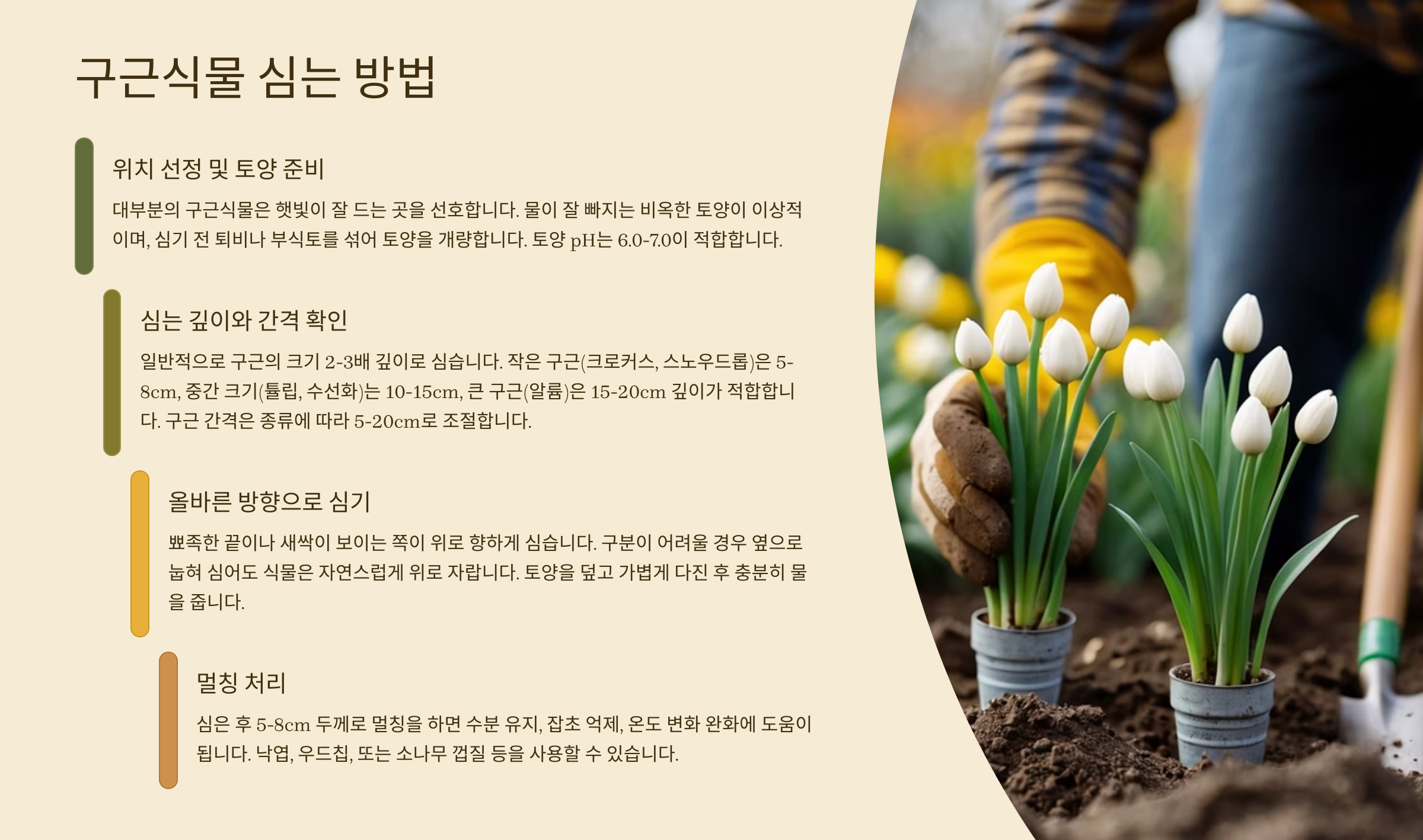 구근식물을 심을 때는 정해진 순서와 방법을 지키는 것이 정말 중요해요. 그래야 구근이 튼튼하게 뿌리를 내리고, 봄에 건강하게 꽃을 피울 수 있거든요. 처음 해보는 분들도 쉽게 따라 할 수 있도록, 기본 순서를 하나하나 차근차근 알려드릴게요!