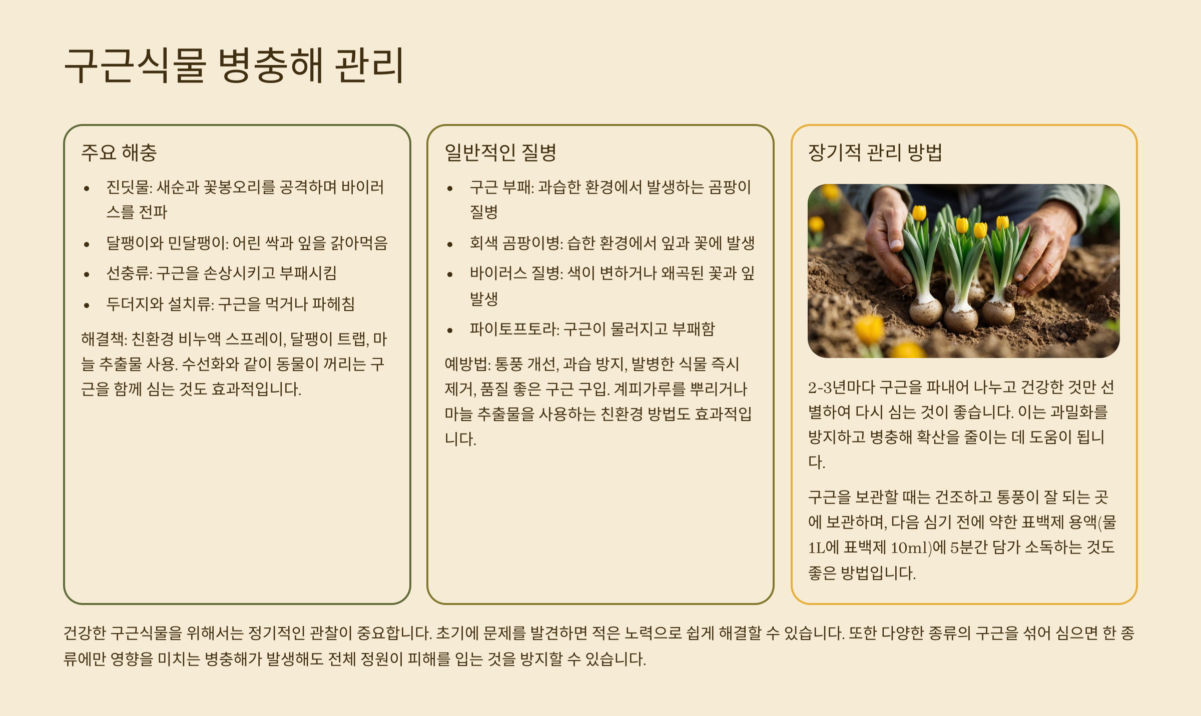 구근식물은 비교적 병충해에 강한 편이지만, 환경이나 관리 상태에 따라 해충이 생기거나 병이 발생하는 경우도 있어요. 특히 가을에 심고 난 뒤부터 봄까지는 자주 살펴보는 것이 좋아요. 무심코 방치하다가 구근이 썩거나 꽃이 피지 않는 일이 생길 수 있거든요.