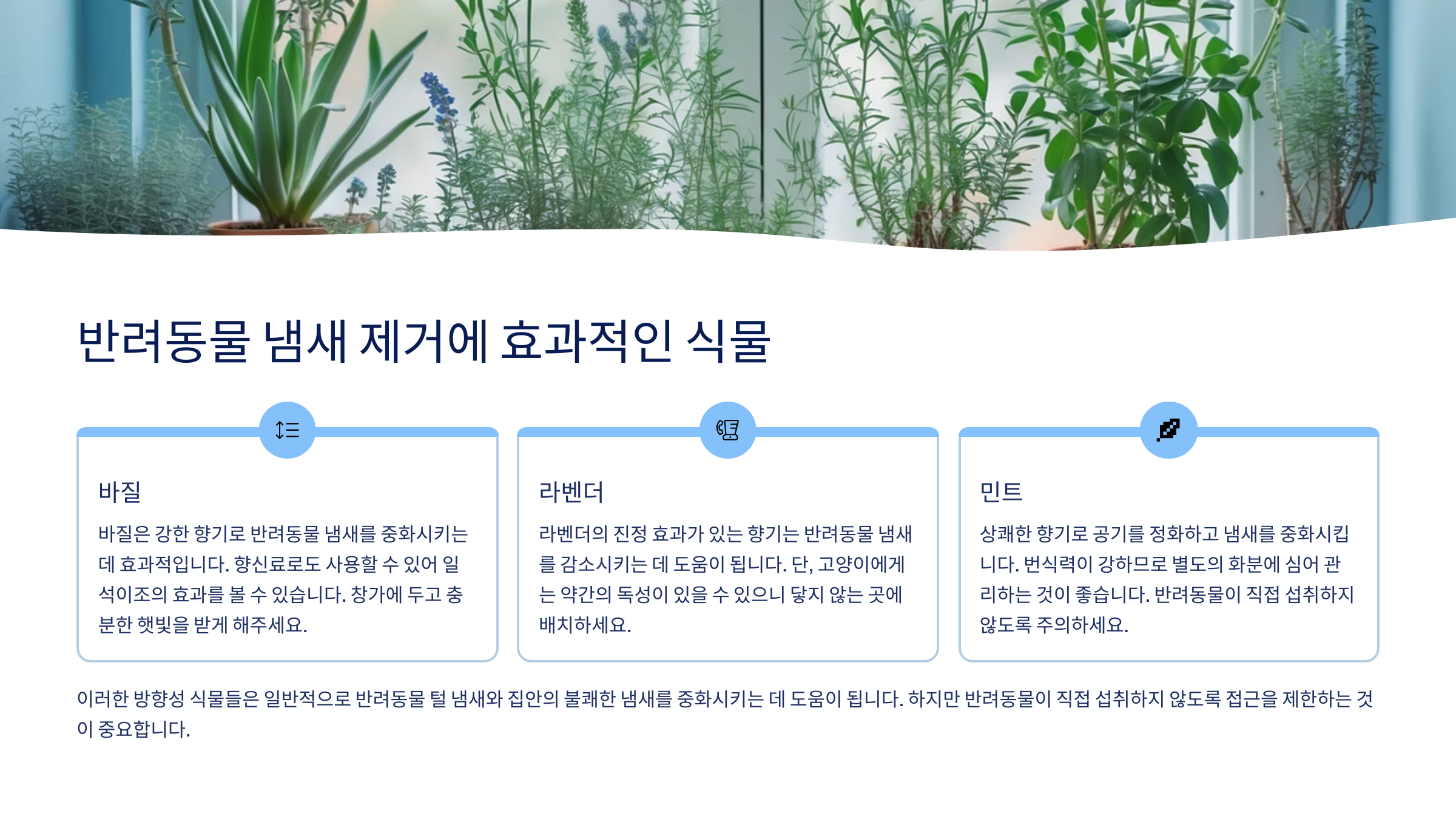 라벤더와 로즈마리는 향기 자체로도 냄새를 가리는 효과가 있고, 스트레스 완화 효과도 있어서 반려동물뿐 아니라 가족들에게도 좋답니다. 특히 고양이나 강아지가 자주 드나드는 공간에는 허브 식물을 두는 것이 훨씬 자연스럽고 친환경적인 방법이에요. 다만, 강한 허브 향에 민감한 반려동물도 있으니 처음 들여놓을 때는 반응을 관찰하는 것이 좋아요.