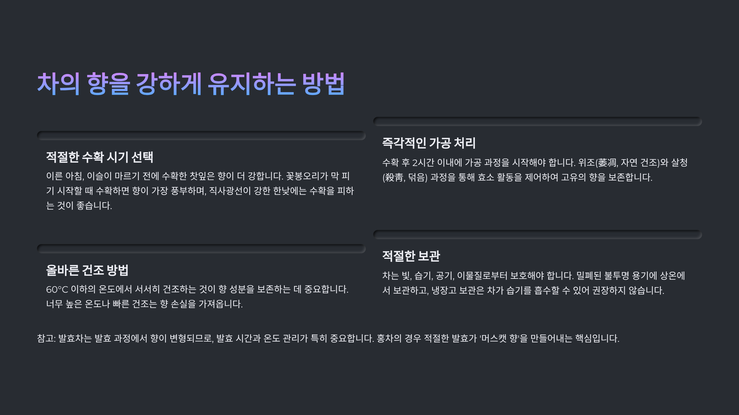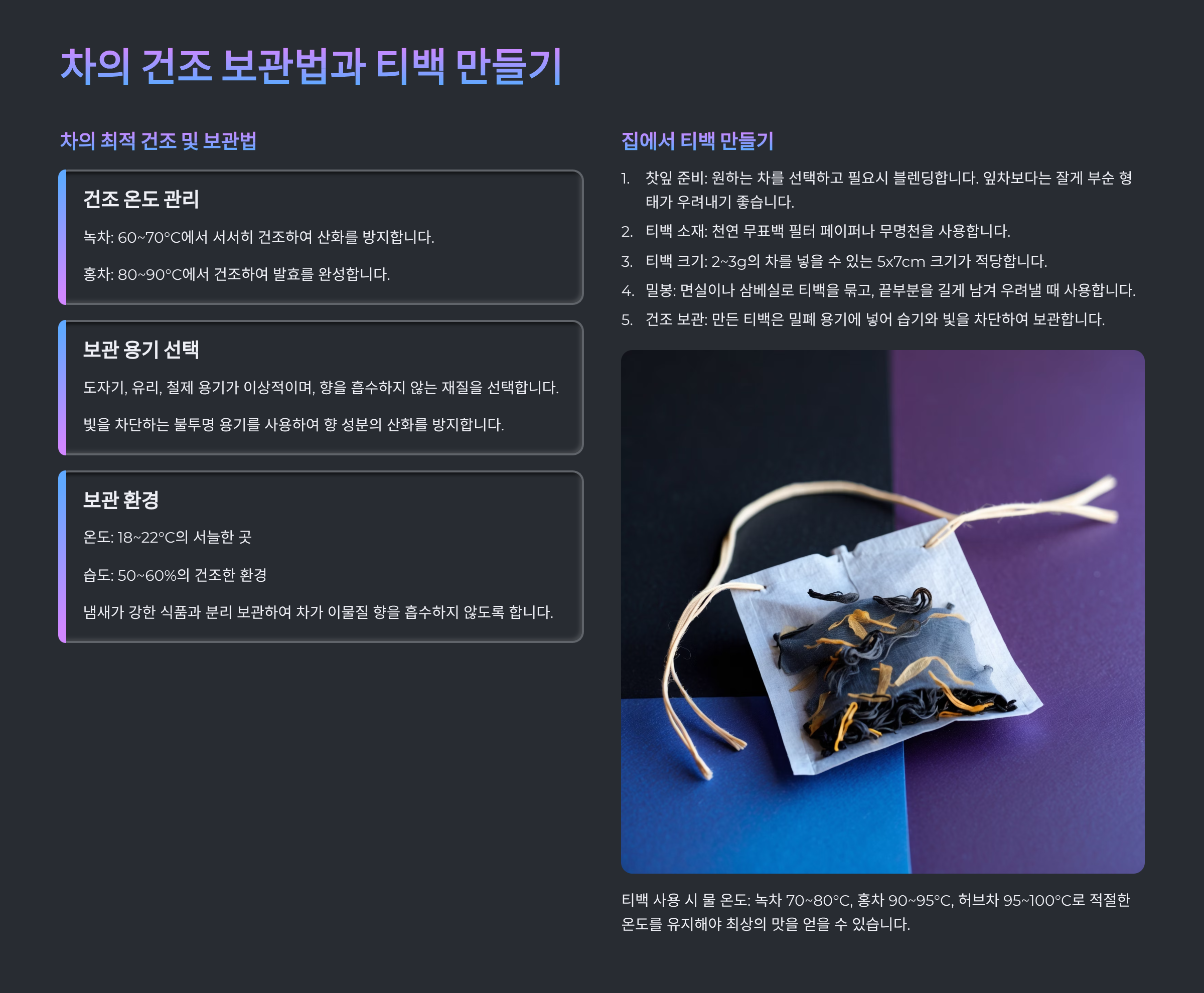 이제 수확 후 건조와 보관, 티백 만드는 법까지 이어서 살펴볼 차례예요.