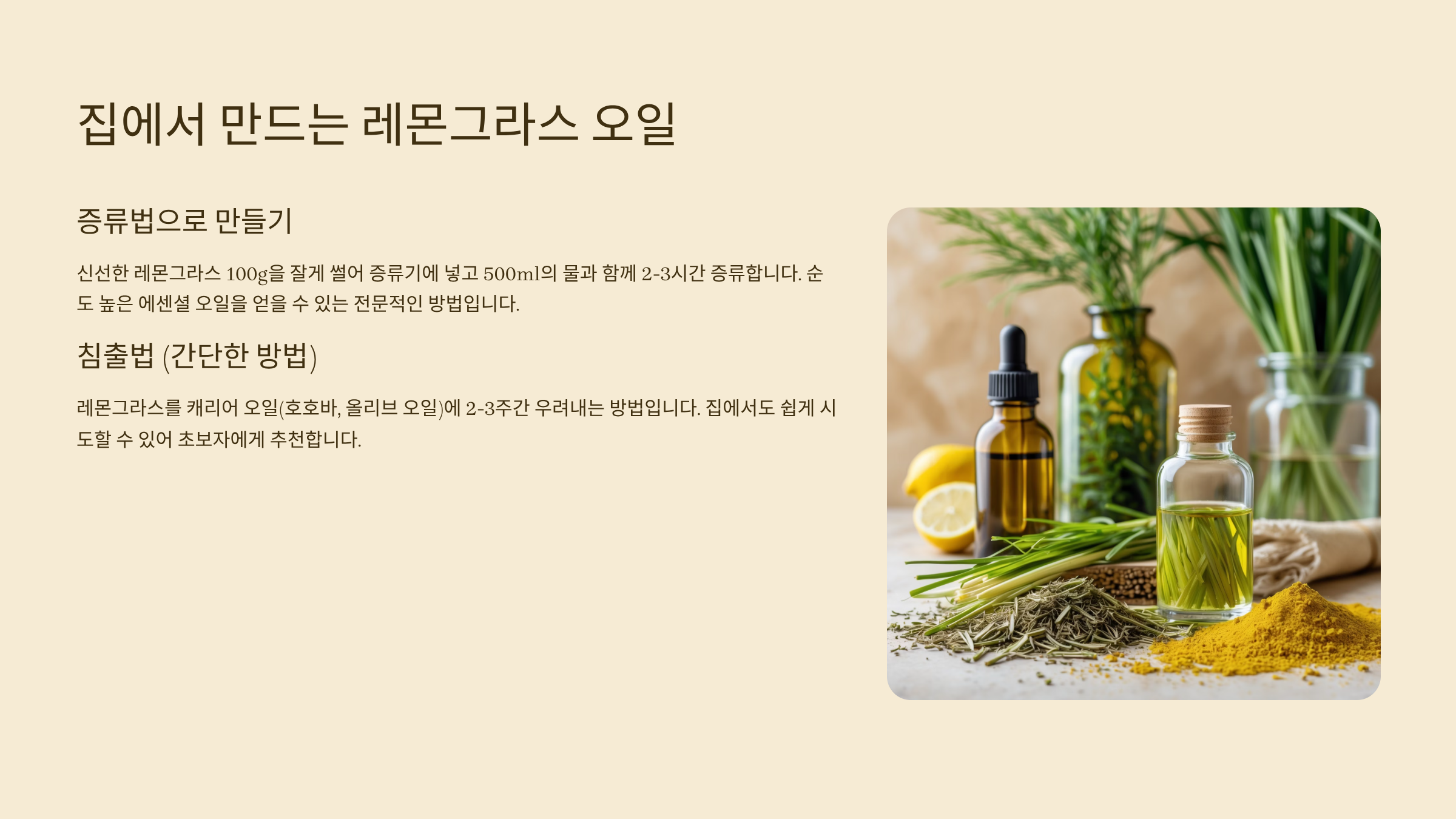 한 가지 팁은 신선한 레몬그라스를 쓸수록 향과 효능이 강해진다는 거예요. 가능하다면 직접 키운 레몬그라스를 사용해보세요. 직접 만든 오일은 시중 제품과는 비교할 수 없는 만족감을 준답니다. 🍃