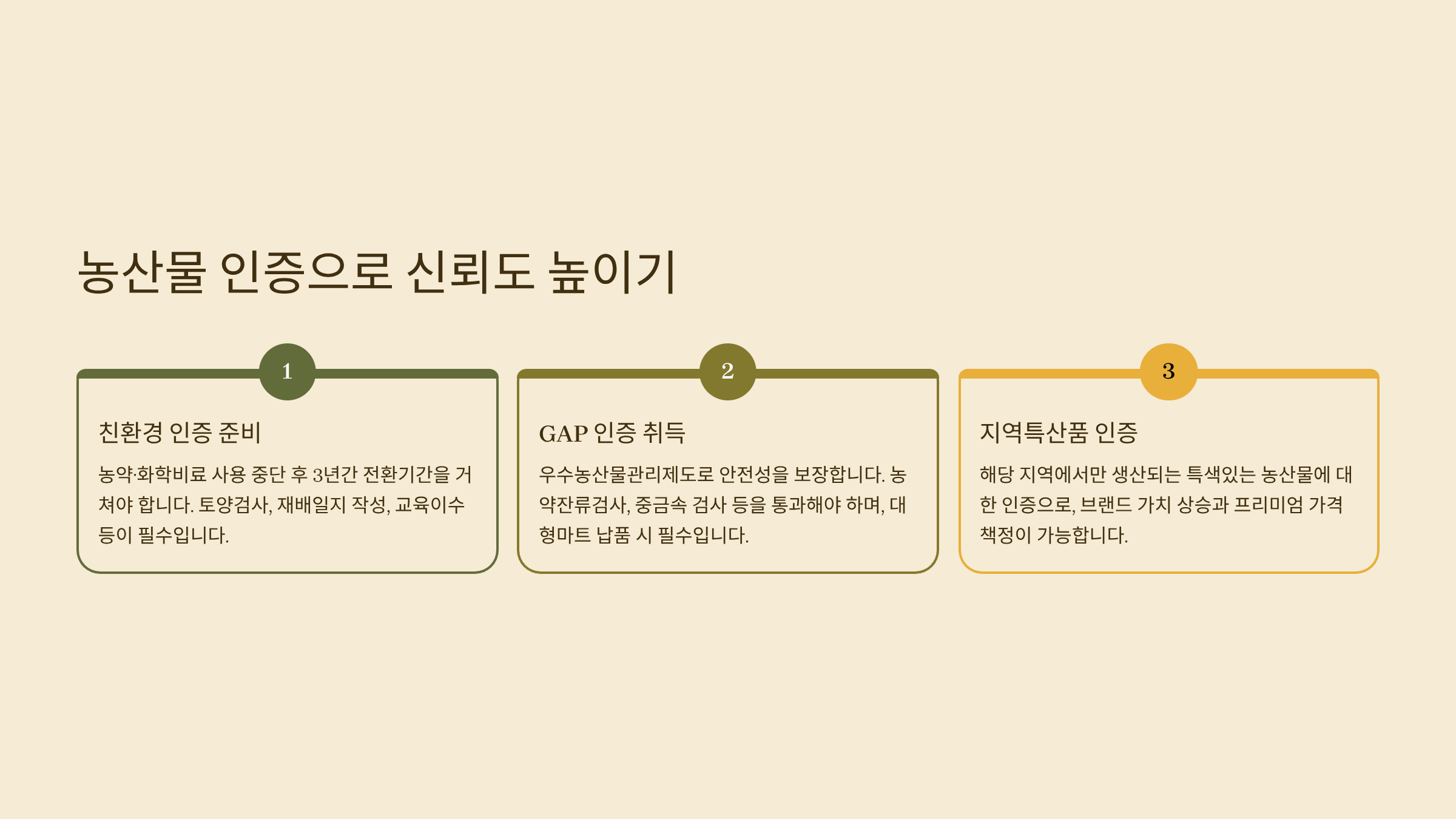 농산물 인증을 받으면 온라인 마켓, 대형 유통망, 로컬 푸드 마켓에서 더 높은 단가로 거래할 수 있어요. 또한 정부 지원사업이나 농업 관련 보조금 신청 시에도 유리한 조건을 얻을 수 있어 장기적인 비즈니스 계획에 큰 도움이 돼요.