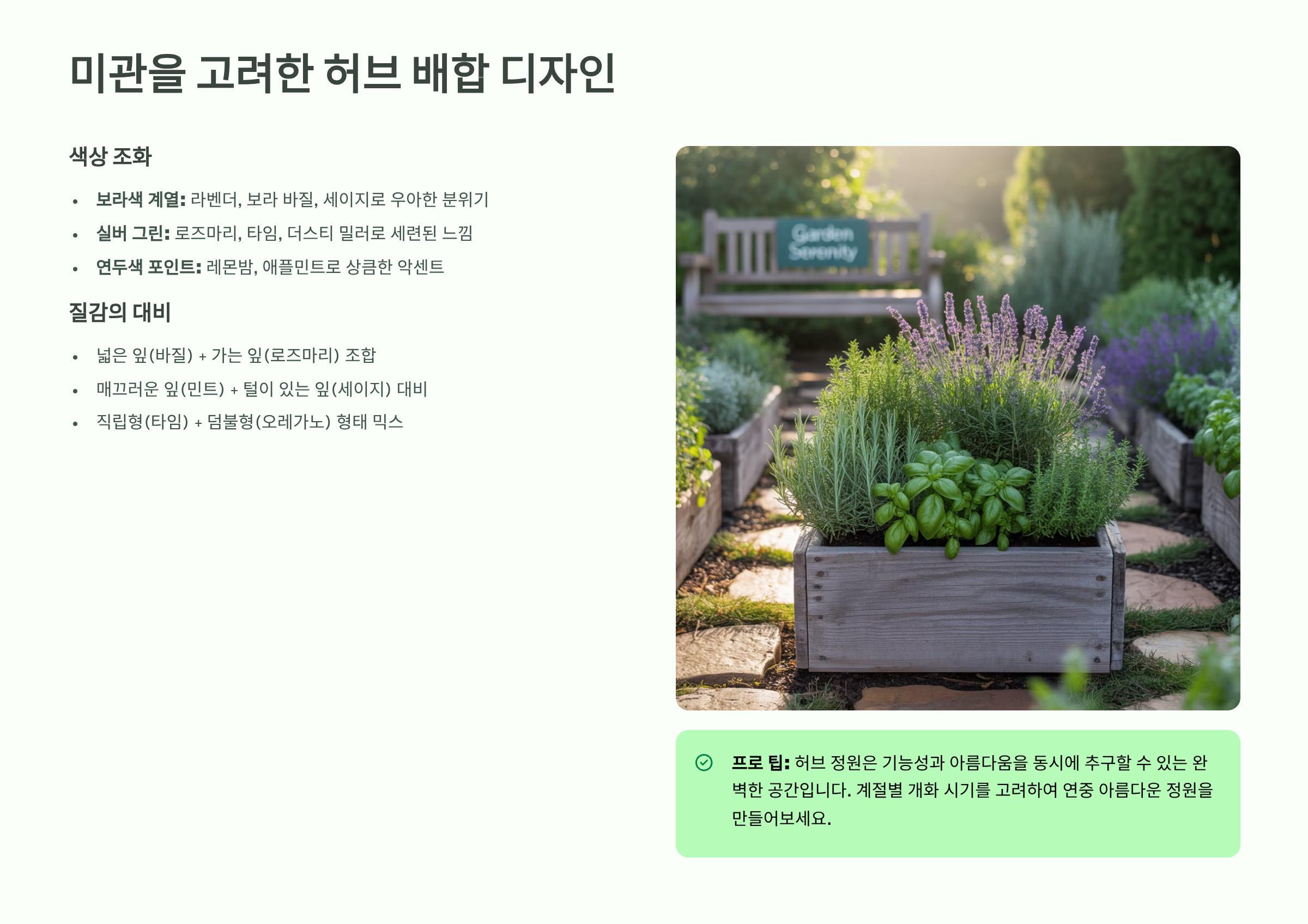 배합 시 계절별 변화를 고려하면 1년 내내 아름다운 정원을 유지할 수 있어요. 봄에는 밝은 색의 허브, 여름에는 푸른 레몬그라스, 가을에는 라벤더의 은은한 색감을 활용하면 계절감이 살아나요. 식물의 성장 속도와 높이를 고려한 디자인은 균형 잡힌 정원을 완성해요.