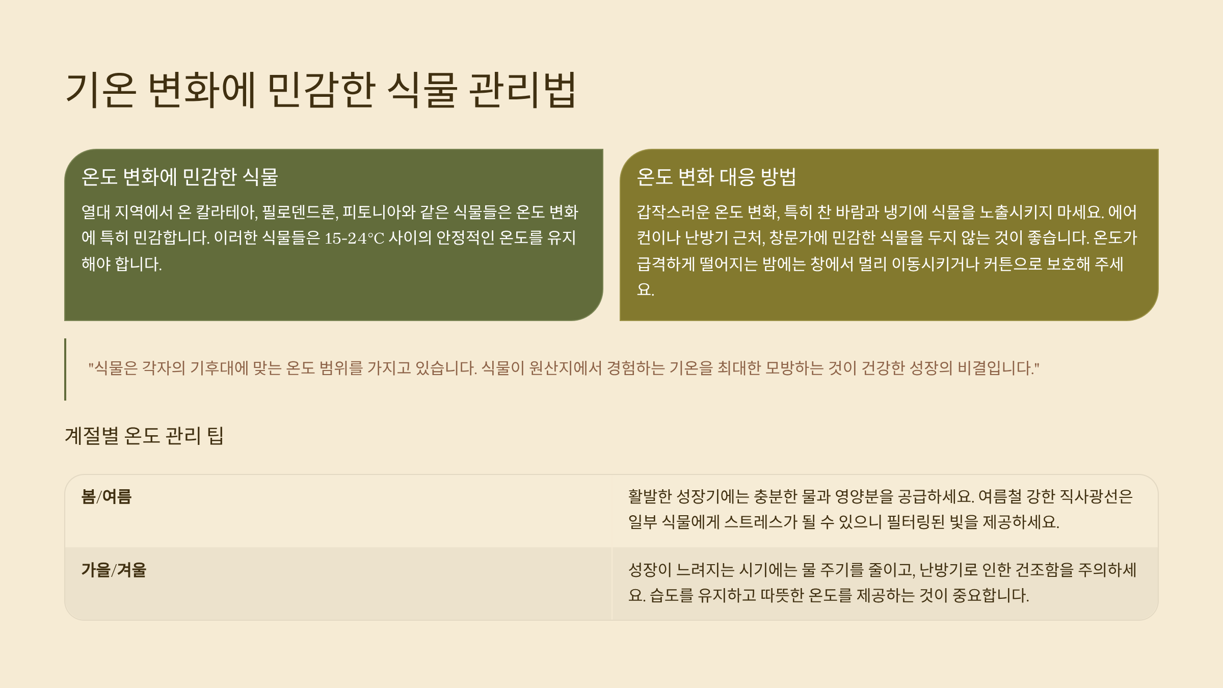 식물도 기온 변화에 예민하게 반응해요. 특히 실내에서 키우는 식물은 계절이 바뀔 때마다 잎이 떨어지거나 성장이 멈추는 현상이 나타나기도 해요. 이유는 단순해요. 실외보다 실내는 온도 차가 급격하게 느껴지고, 식물은 그 스트레스를 고스란히 받기 때문이에요. 🌿🥶