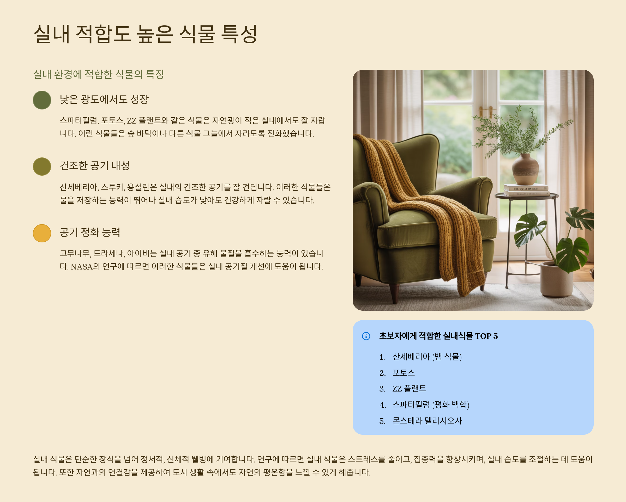 그럼 이번에는 실내에서 키우기에 적합한 식물의 조건과 성향에 대해 살펴볼게요! 🌿🏡