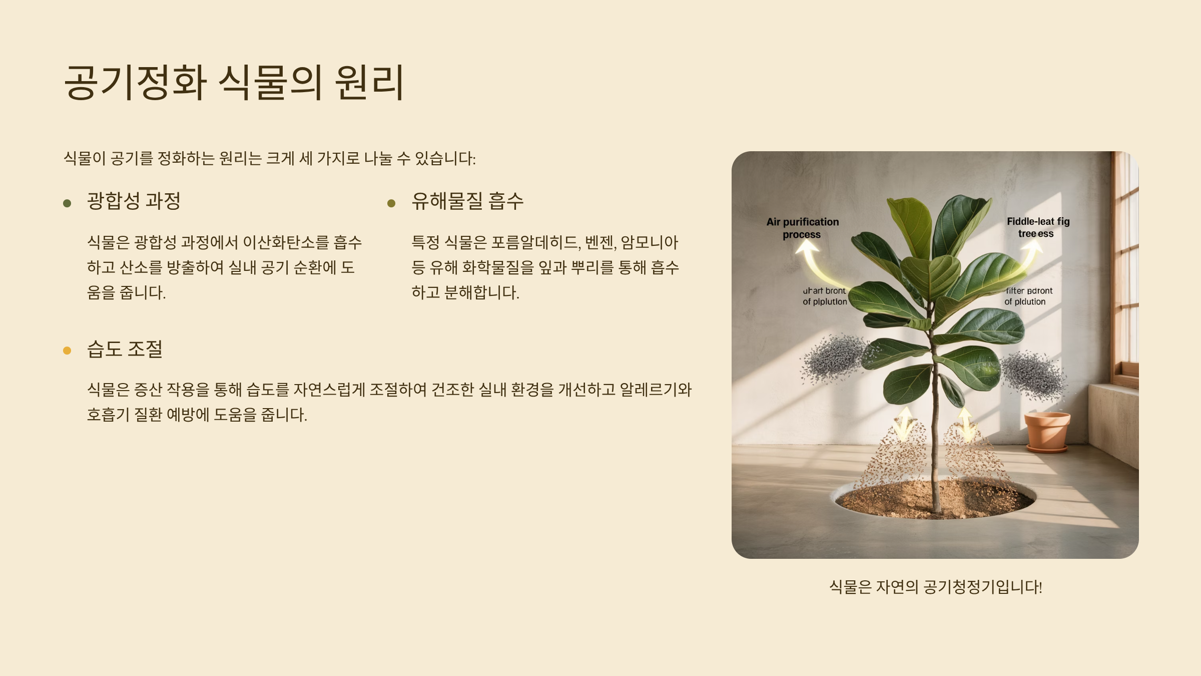 공기정화 식물은 단순히 산소를 만들어내는 식물이 아니에요. 식물의 잎, 뿌리, 미생물 등이 복합적으로 작용해서 실내 공기 중의 유해물질을 제거해주는 시스템을 가지고 있어요. 정말 자연의 공기청정기라고 불릴 만하죠!