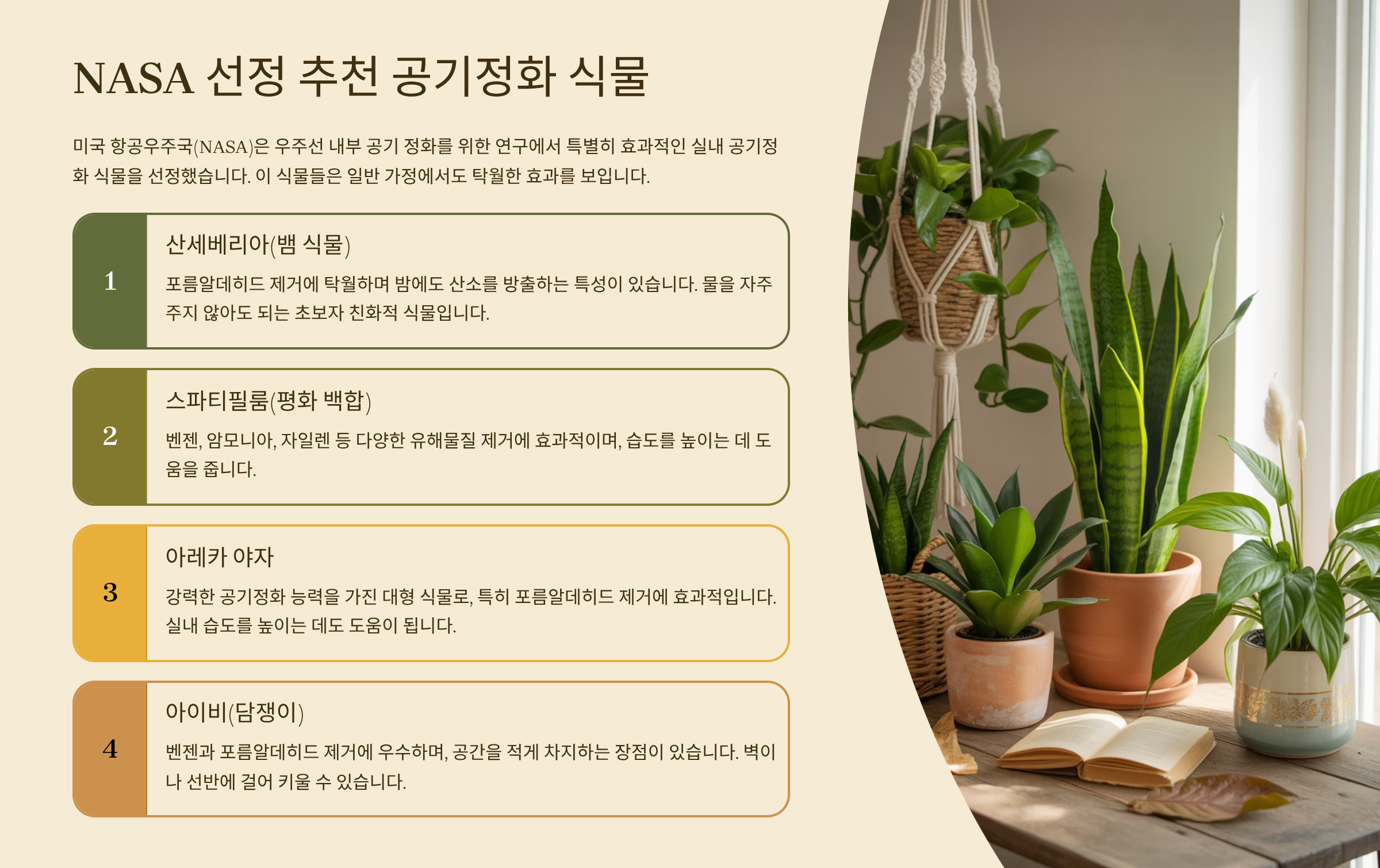 NASA는 우주선 내부 공기 정화를 위해 어떤 식물이 가장 효과적인지를 연구했어요. 그 결과, 실제 공기 정화에 탁월한 능력을 가진 식물들을 발표했죠. 이 목록은 전 세계적으로 '신뢰도 100%'로 인정받고 있어요!