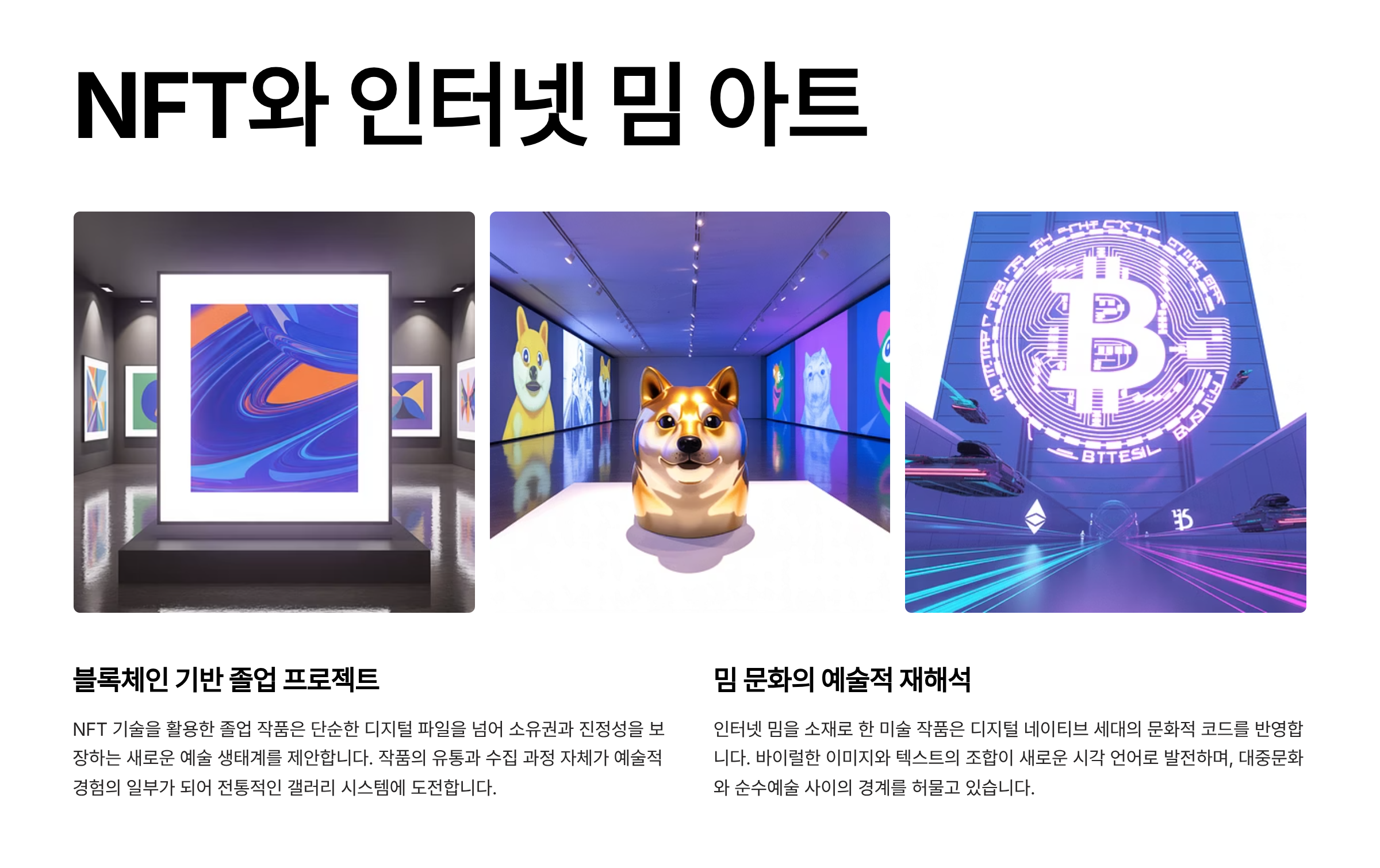 졸업전시회에서 눈에 띄었던 또 하나의 흐름은 바로 NFT 기술을 기반으로 한 디지털 예술 작품들이었어요. 단순히 이미지나 영상을 보여주는 데 그치지 않고, 블록체인에 등록된 NFT를 통해 ‘소유’와 ‘유통’ 개념까지 반영한 프로젝트들이 등장했죠.