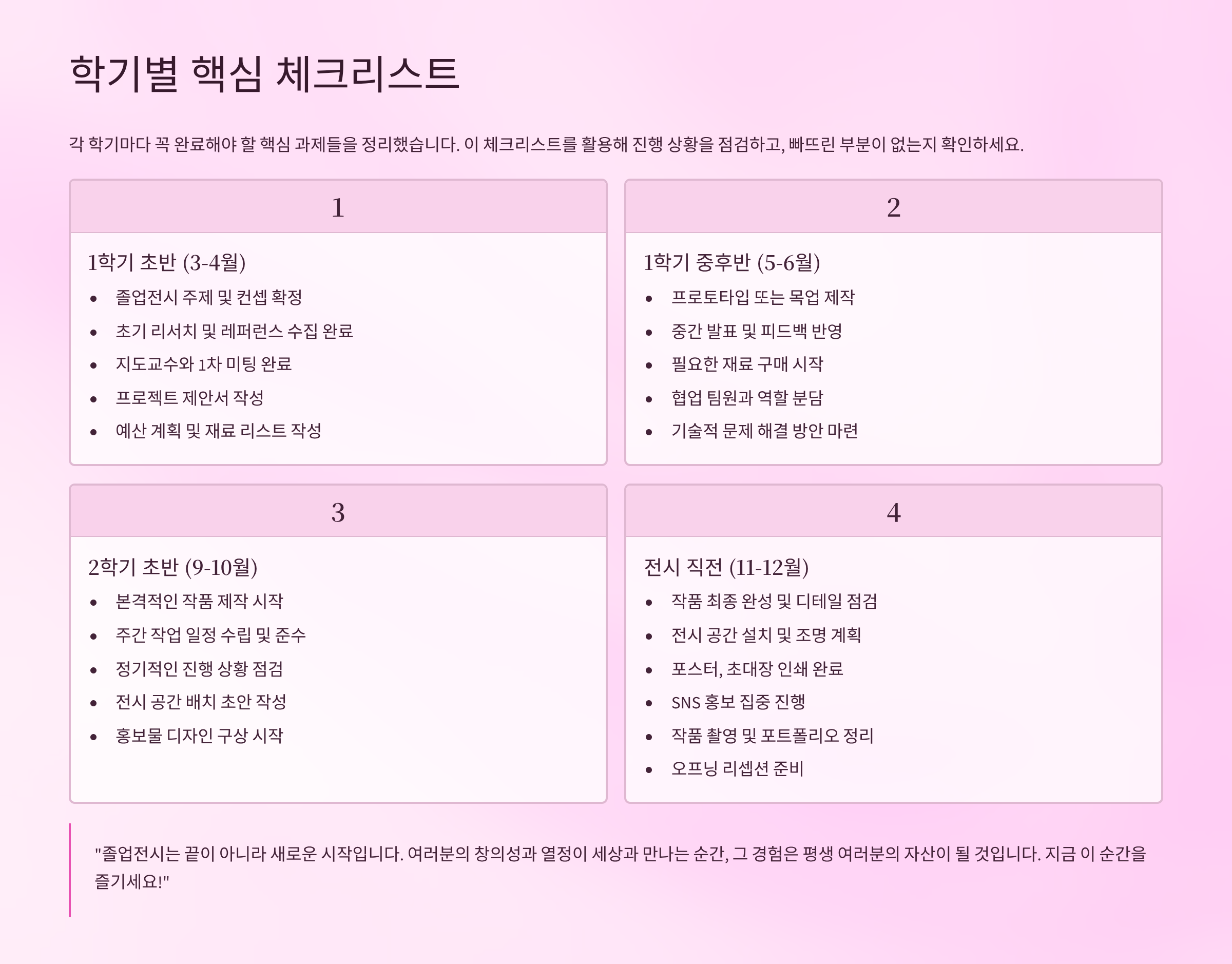 졸업전시를 성공적으로 마치기 위해선 단계별 체크리스트가 정말 중요해요. 마감 직전까지 무작정 달리는 것보다, 시기별로 무엇을 해야 하는지 정리해두면 훨씬 효율적이에요. 학기마다 꼭 챙겨야 할 핵심 포인트를 정리해볼게요.