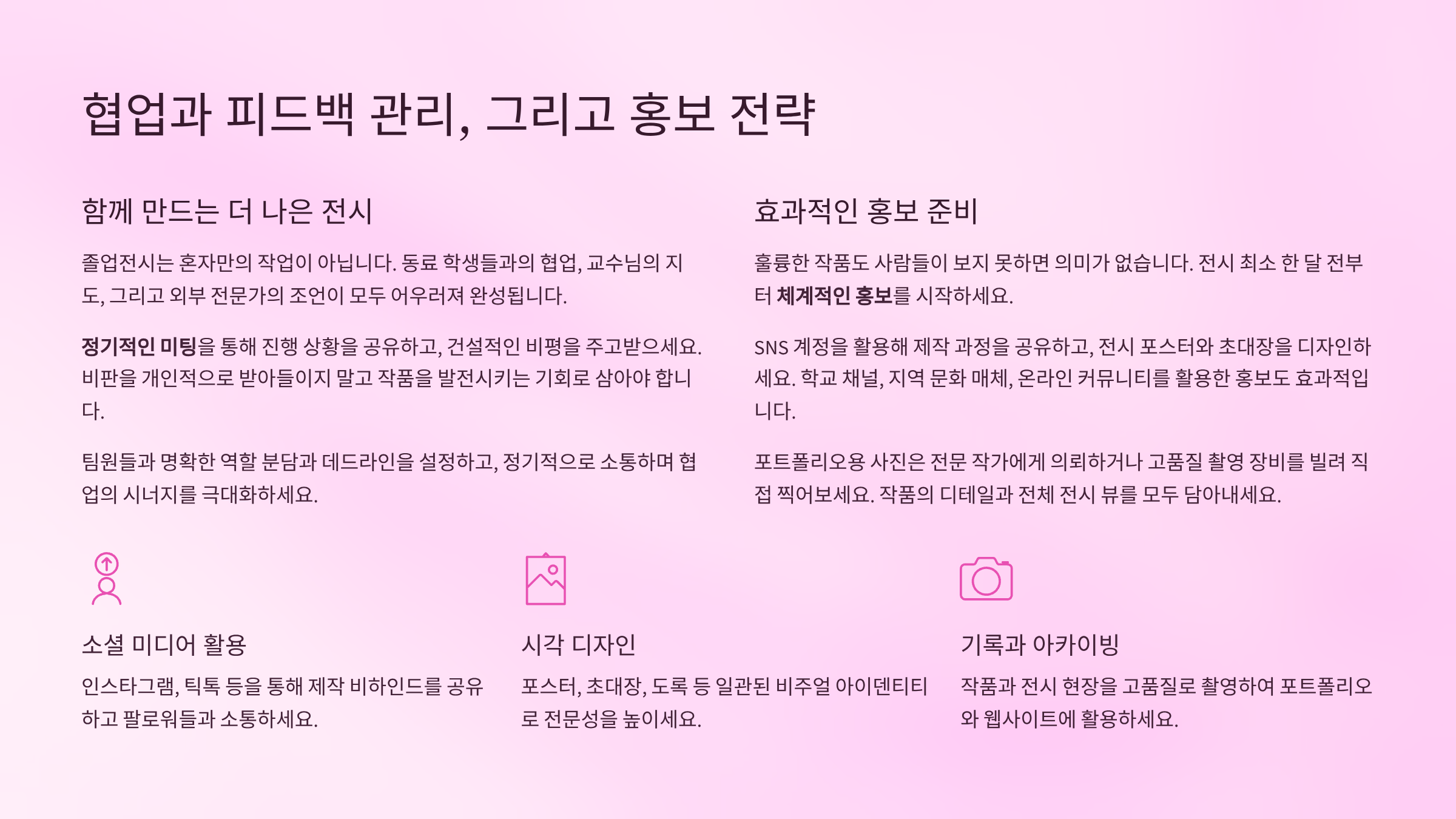 한 가지 팁! 전시 오프닝 날에는 '작가 소개 영상'이나 '라이브 퍼포먼스'도 좋은 인상을 남길 수 있어요. 졸업전시는 단순한 전시가 아니라 ‘경험’이 되어야 하니까요. 관객에게 기억에 남는 장면을 선사해보세요! 🎬