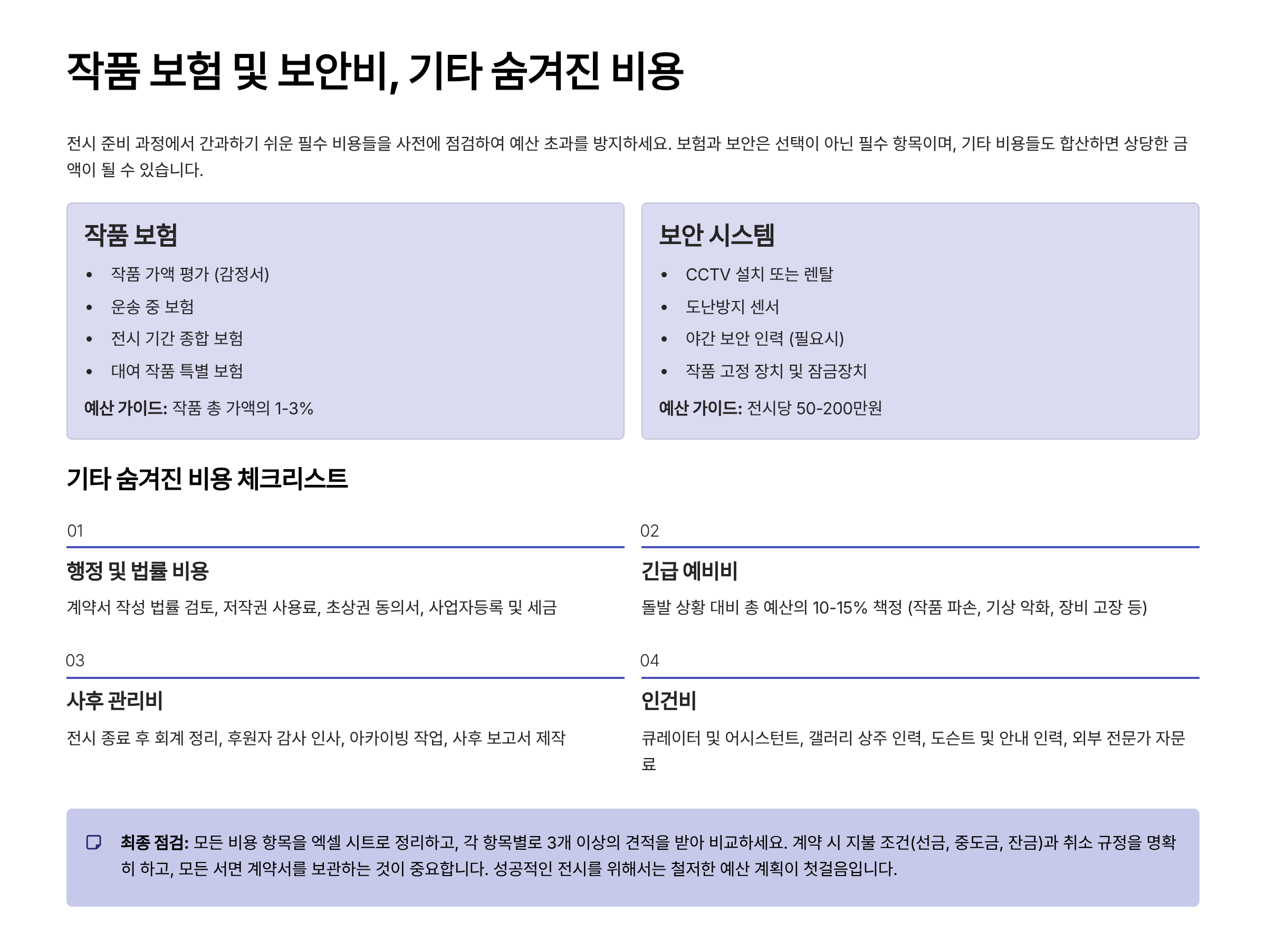 보안 문제도 고려해야 해요. 일부 갤러리는 전시 기간 동안 상주 관리 인력이 없기 때문에 도난 위험이 존재할 수 있어요. 이런 경우 CCTV 설치나 도어락 설정, 자체 야간 관리 인력 고용 등을 통해 보안을 강화해야 해요.