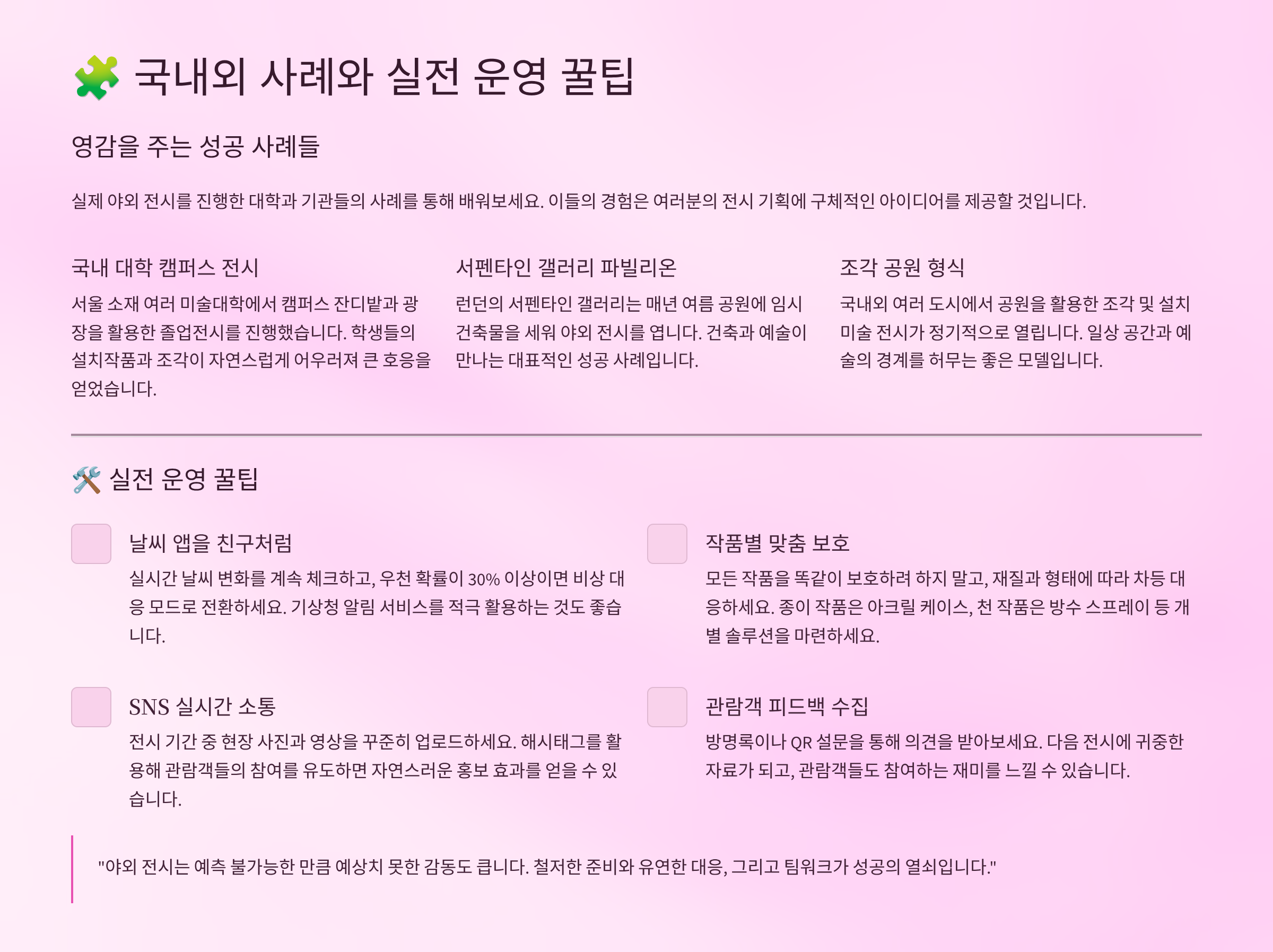 이런 사례를 참고하면 나만의 독창적인 전시를 기획하는 데 큰 도움이 될 거예요. 전시 자체를 ‘경험’으로 만들고 싶다면 야외 공간만큼 좋은 무대는 드물죠. 🎪