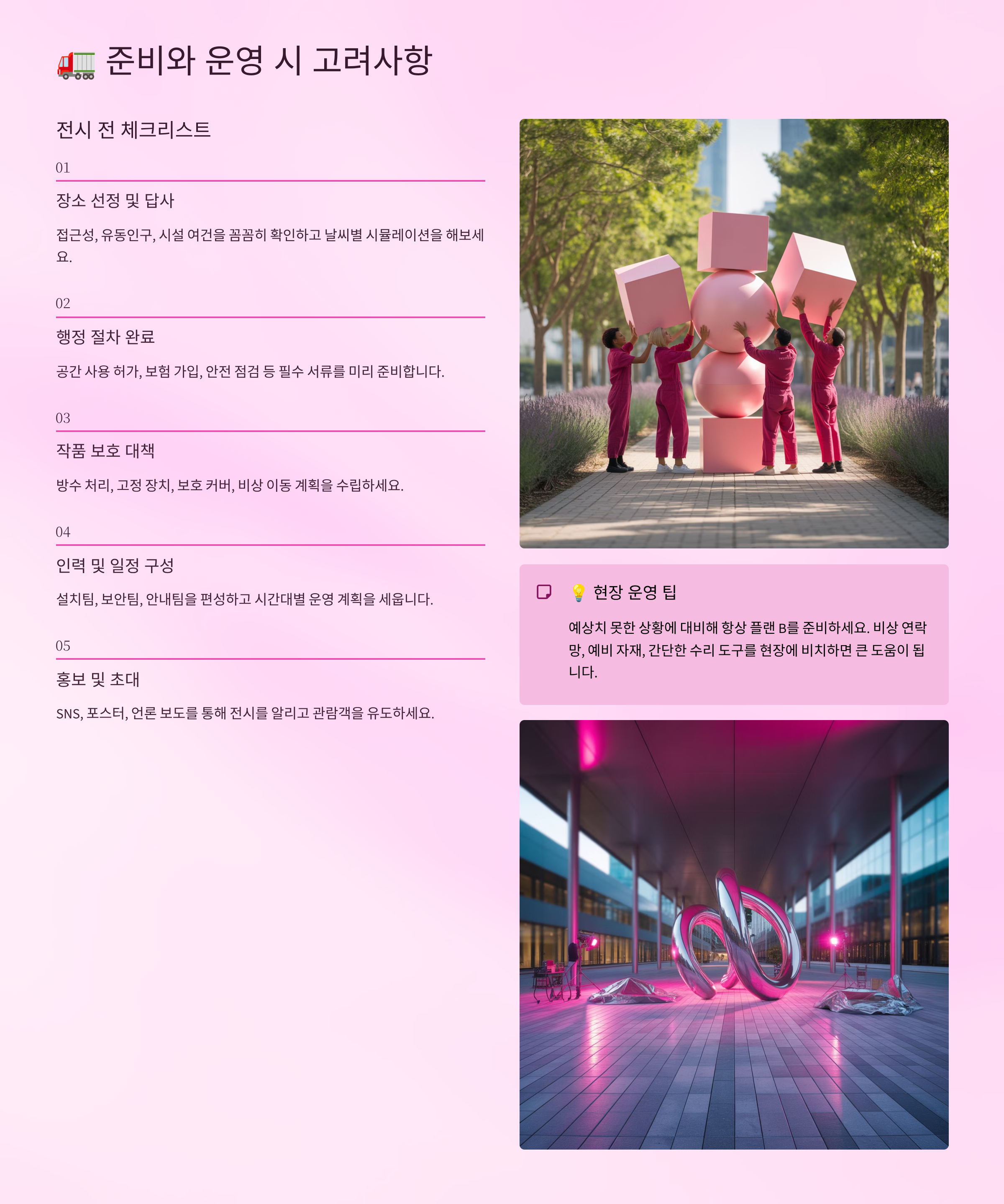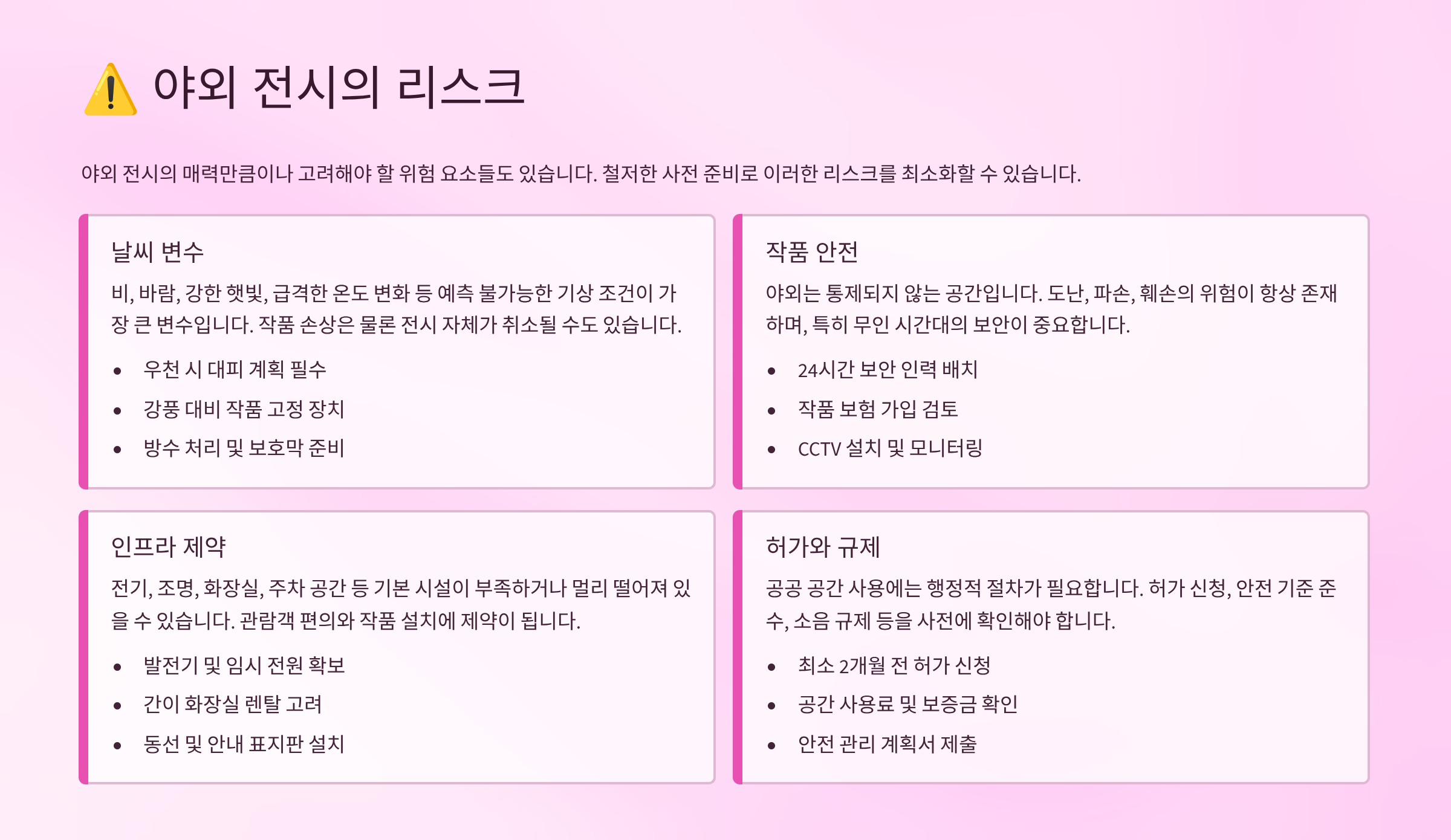 기획 단계에서부터 설치와 철거, 유지보수까지 모두 신경 써야 하기 때문에 일반 실내 전시보다 운영이 더 복잡할 수 있어요. 작품 보호와 시설 관리에 대한 고민도 필수랍니다.