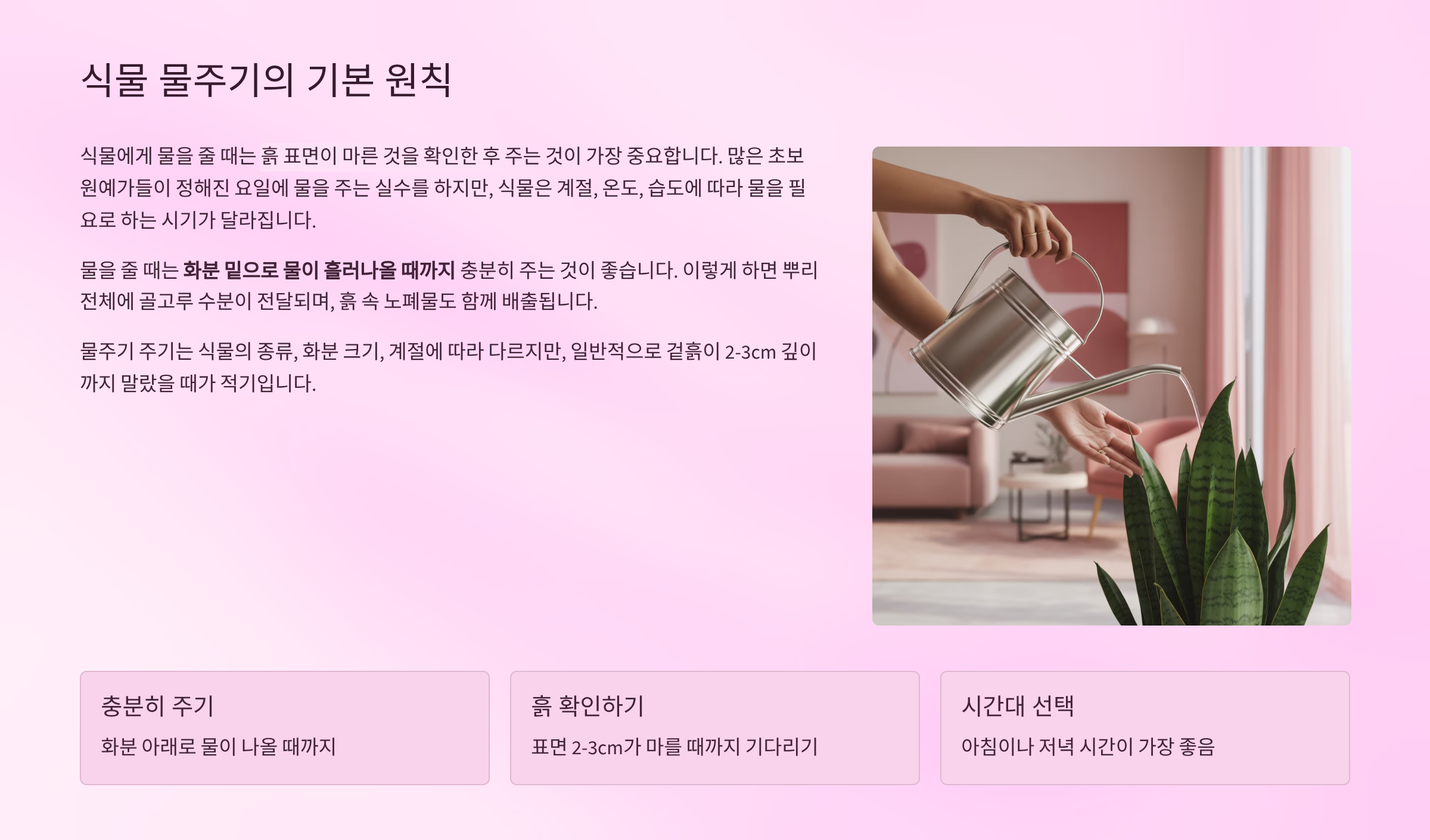 내가 생각했을 때 가장 실수하기 쉬운 부분이 바로 ‘모든 식물에게 똑같이 물을 주는 것’인 것 같아요. 식물마다 고유한 물주기 리듬이 있어서, 그 특성을 이해하는 게 진짜 반려식물로 키우는 첫걸음이에요. 물주기는 결국 ‘관찰’에서 시작된답니다!