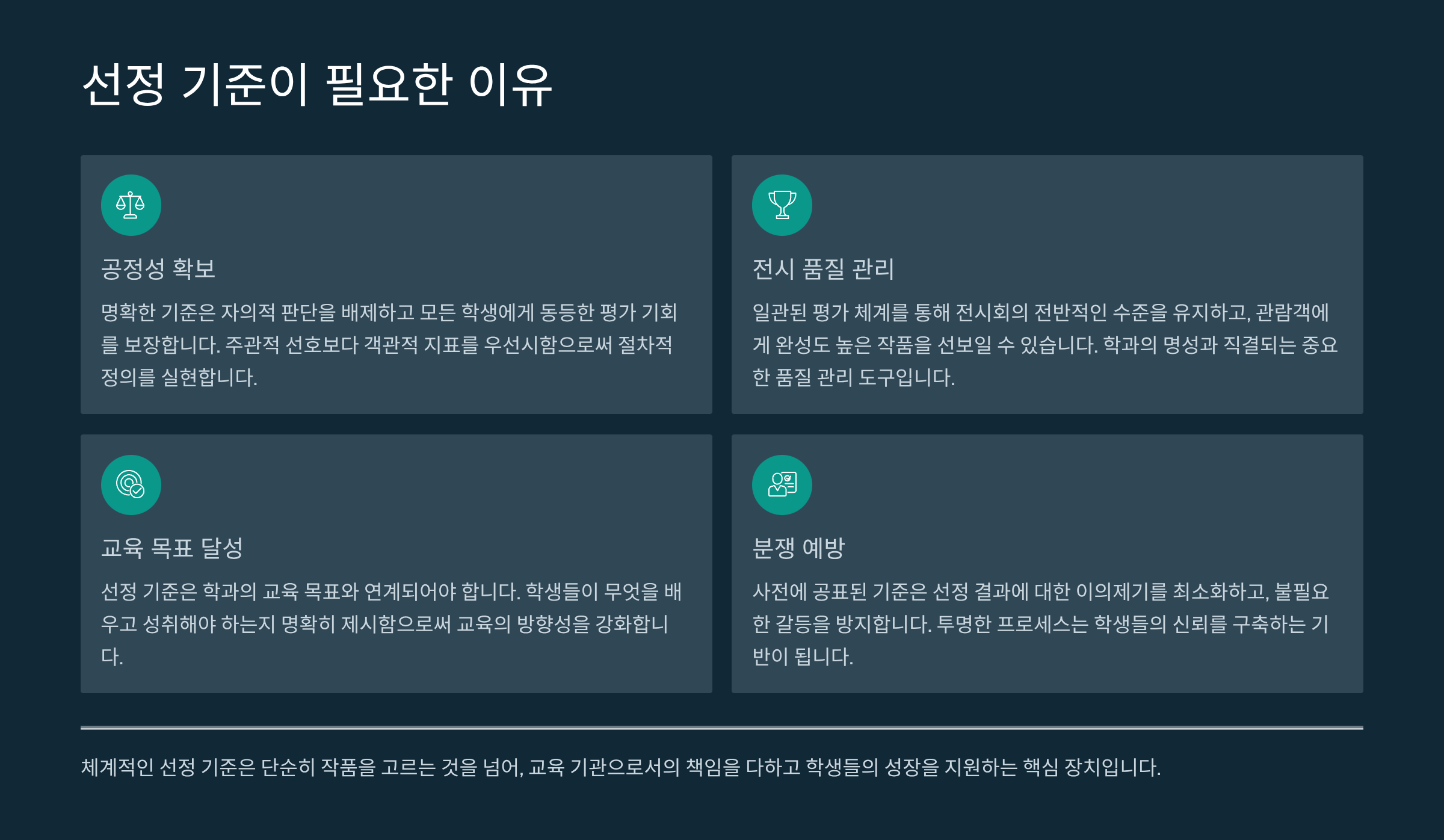 이렇게 절차를 세분화하고 사전 공유하면, 학생들이 결과에 납득할 수 있는 분위기가 형성돼요. 불필요한 오해와 분란 없이 모두가 신뢰하는 전시회가 될 수 있답니다. 🙌