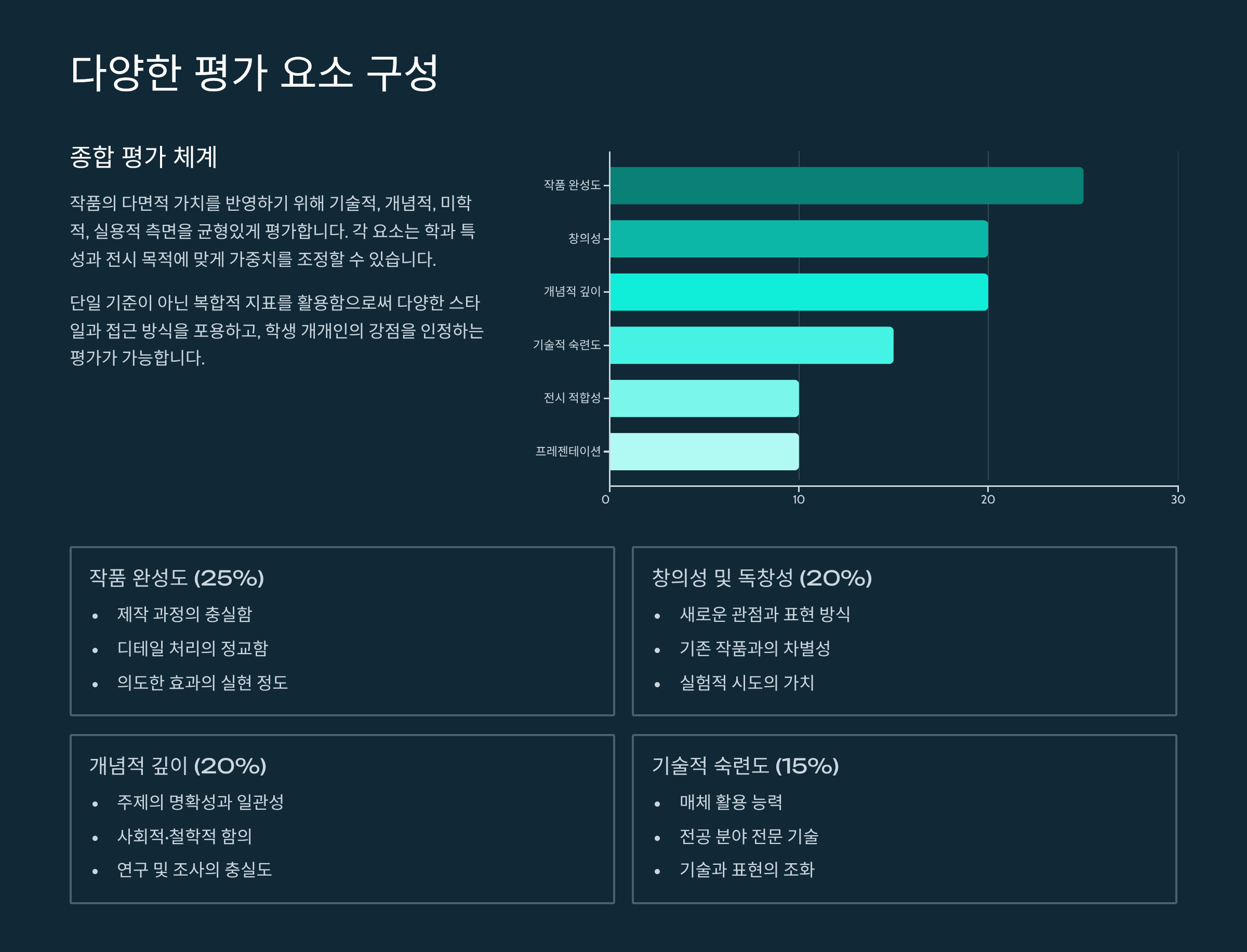 특히 중요한 건 이 평가 항목들이 학생들에게도 명확히 공유돼야 한다는 거예요. 그래야 학생들도 어떤 부분에 중점을 두어 작품을 준비할 수 있거든요. 만약 평가자만 알고 있다면, 작품은 기준 없이 ‘추측’으로 만들어지게 돼요.