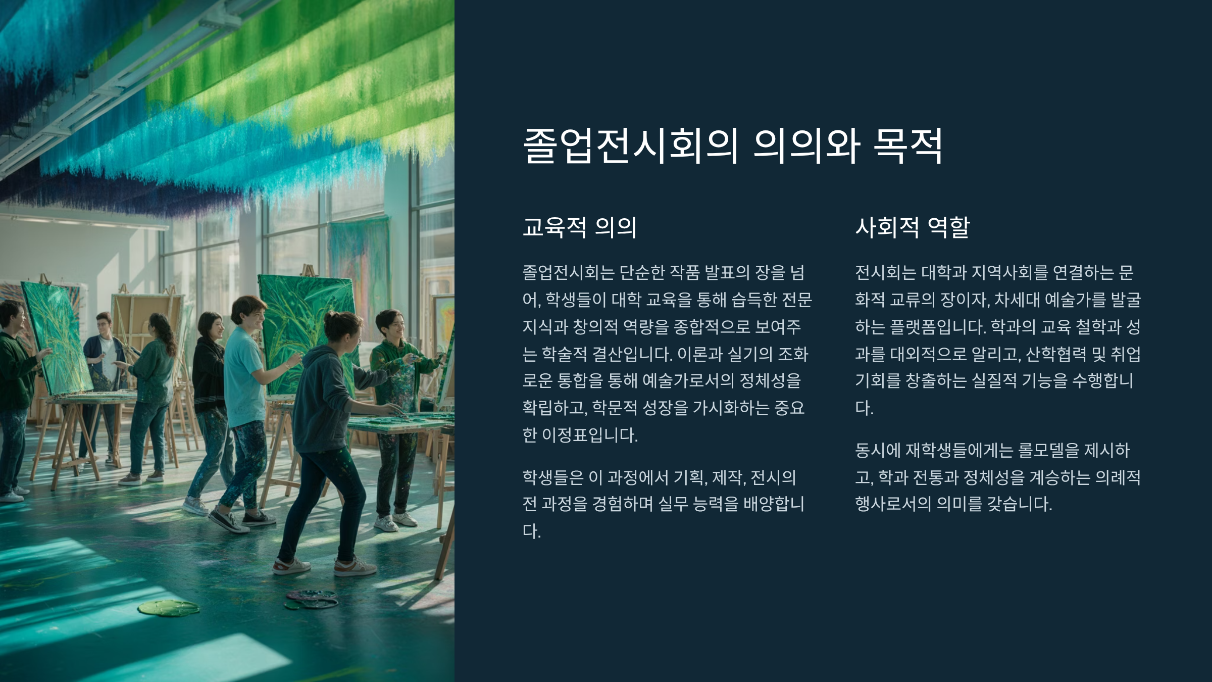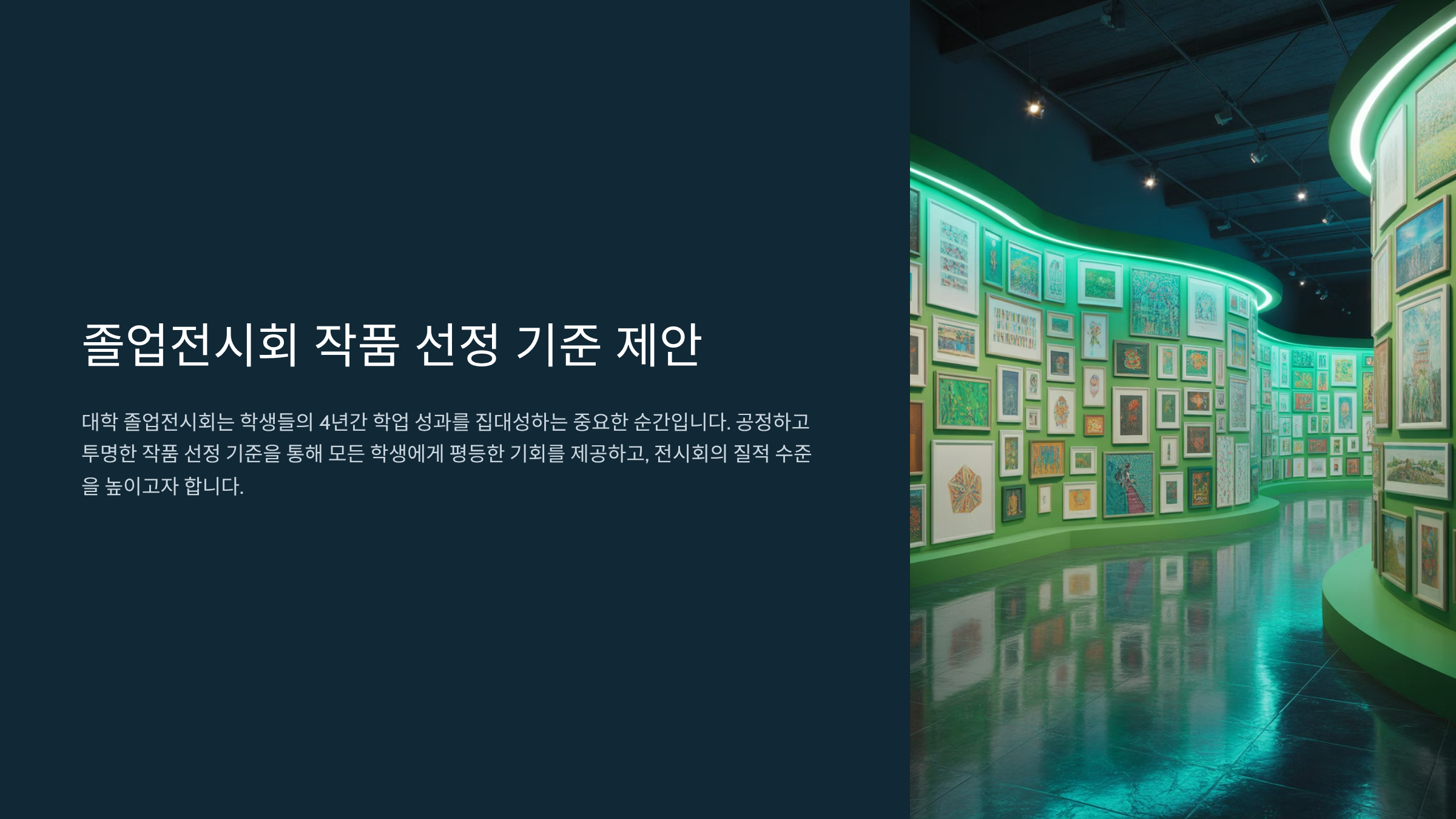 졸업전시회는 학교 교육이 이론에만 머물지 않고 실무적으로 연결되는 중요한 교량이에요. 따라서 이 전시회에 오를 작품을 어떻게 선정하느냐는 단순한 절차가 아니라 교육의 연장선에서 봐야 해요.
